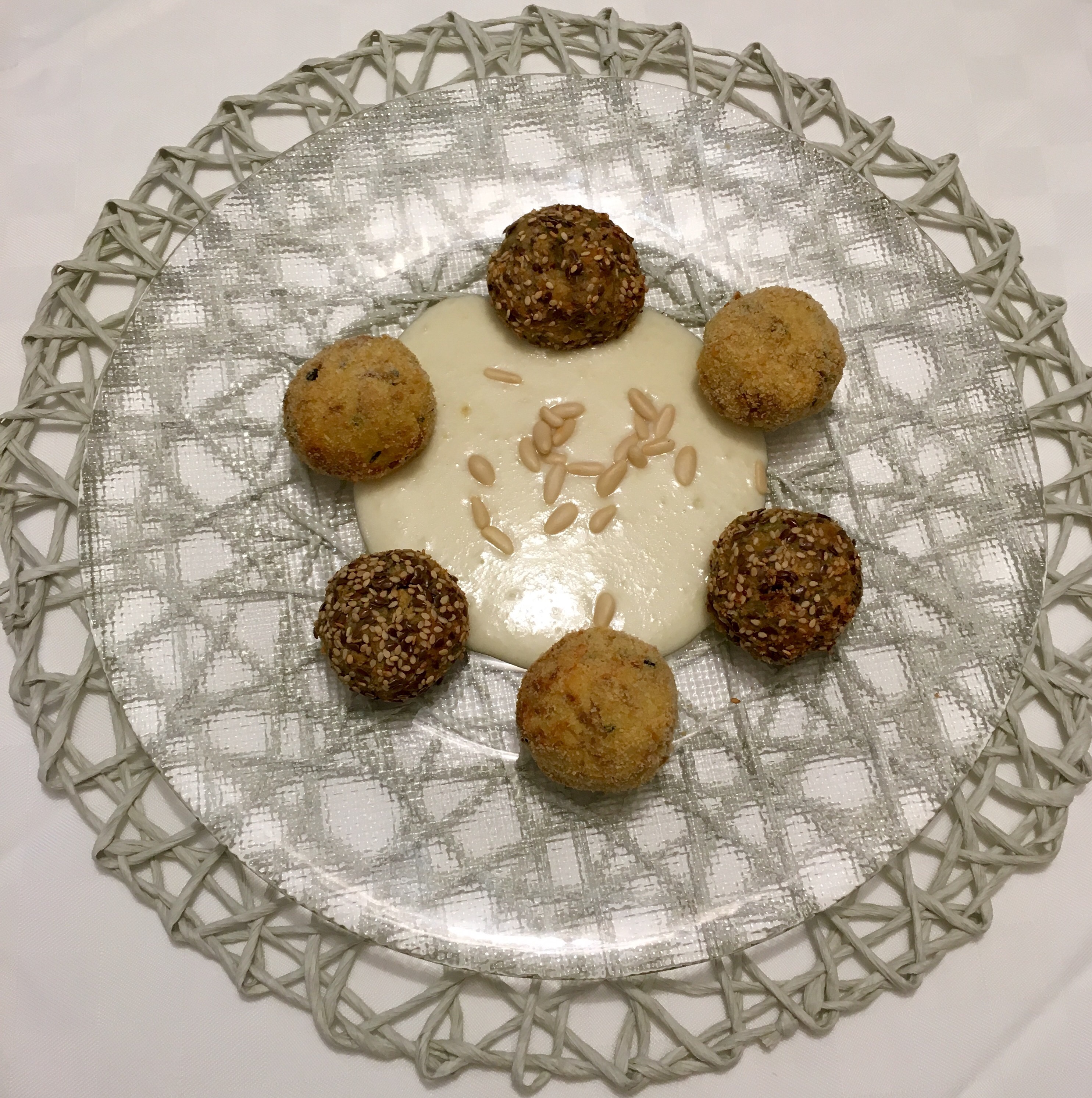 - Servire ponendo al centro del piatto o sotto le polpette la crema di parmigiano, decorate con i pinoli.