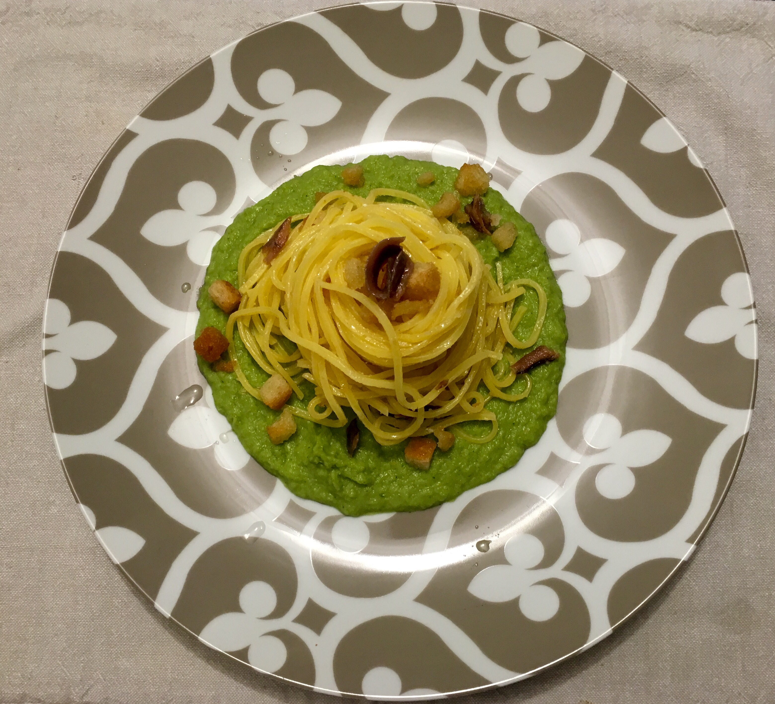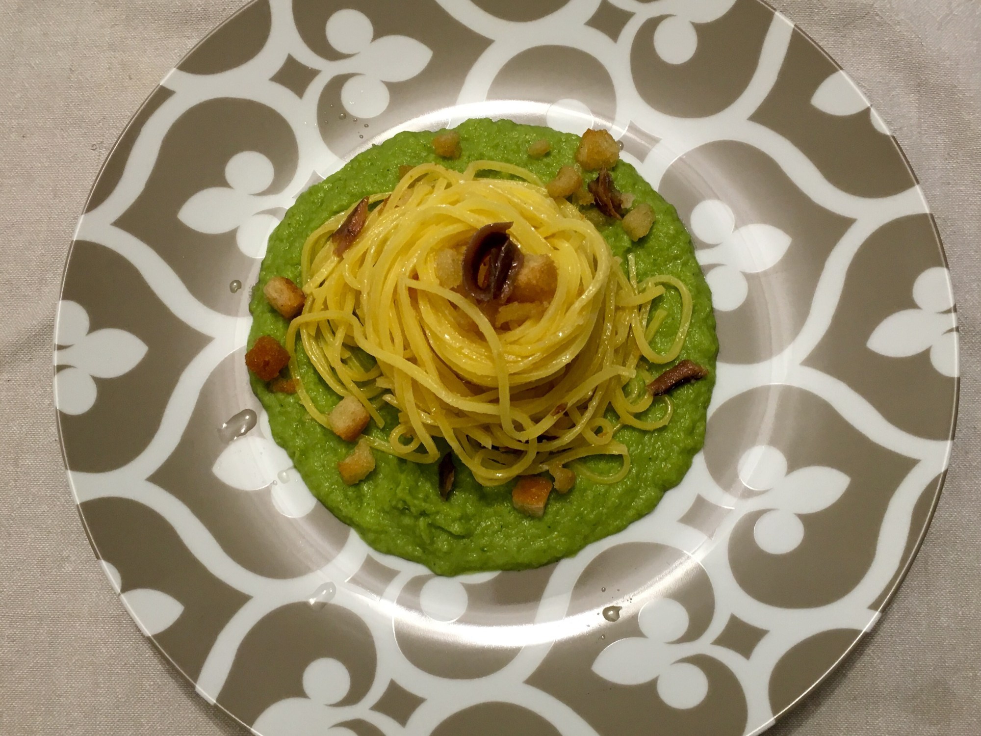 - Servite impiattando prima la crema di broccoli e appoggiandovi sopra gli spaghetti. Guarnire con un acciuga intera.