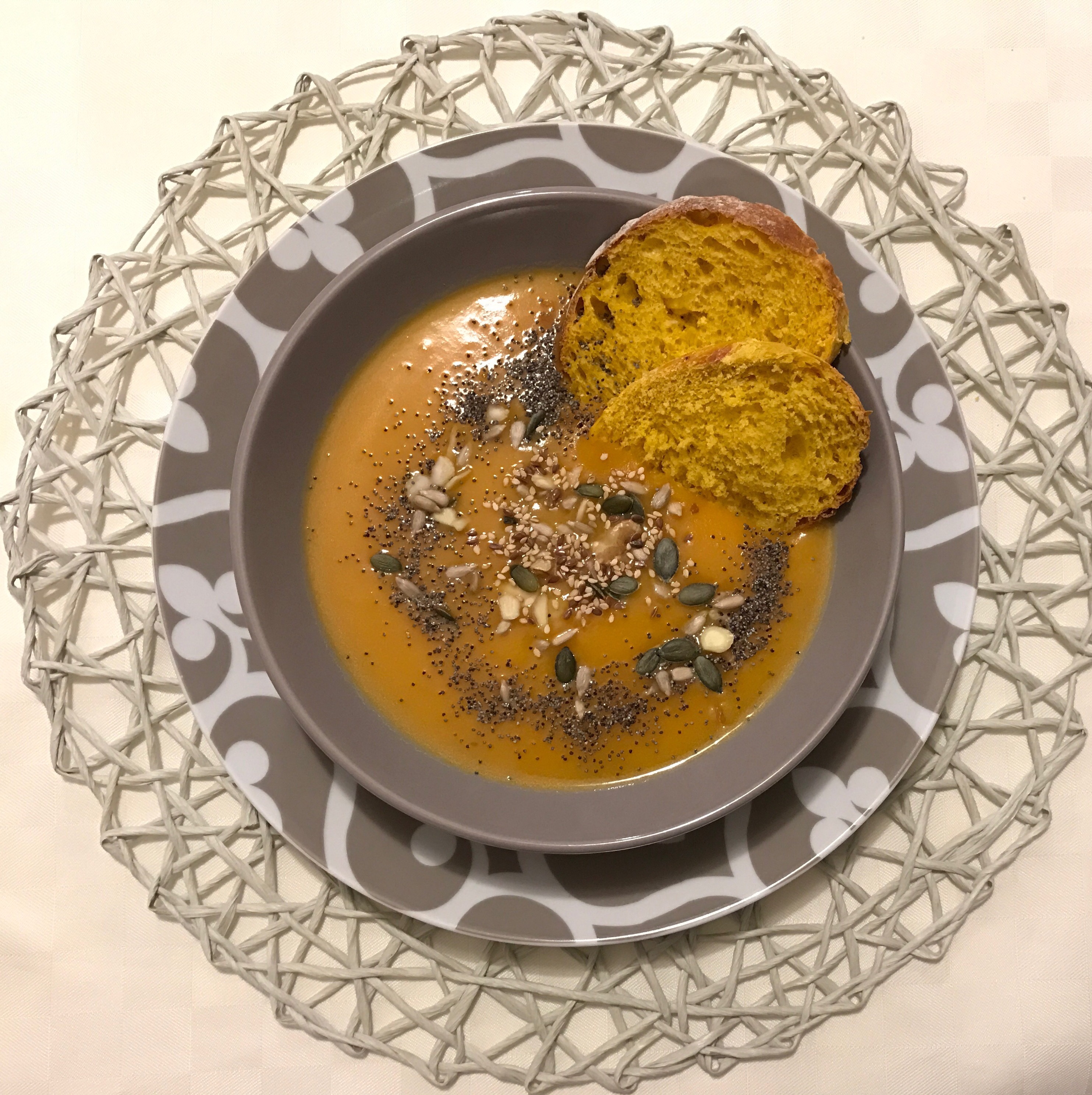 - Servire con dei crostini di pane (io ho scelto pane alla zucca!) e guarnire con semi a piacimento oppure frutta secca.