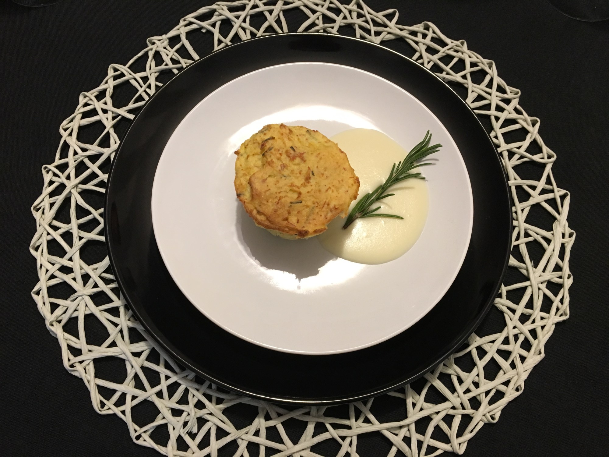 - Servire il tortino togliendolo dallo stampino in alluminio, decorando con un cucchiaio di crema e un ciuffo di rosmarino.