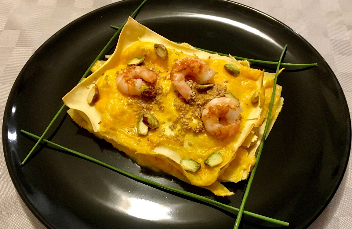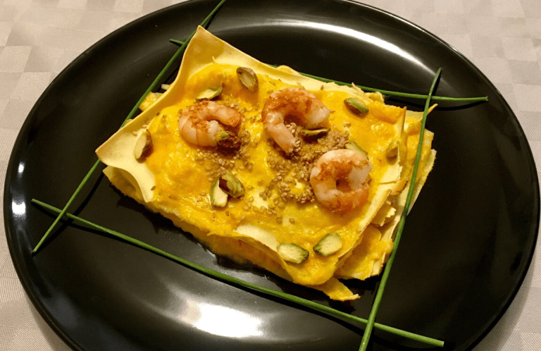 - Nel frattempo scottare in padella i gamberi per decorare, una volta sfornate le lasagne servire e guarnire oltre che con le code intere anche con un trito di pistacchi salati ed erba cipollina.