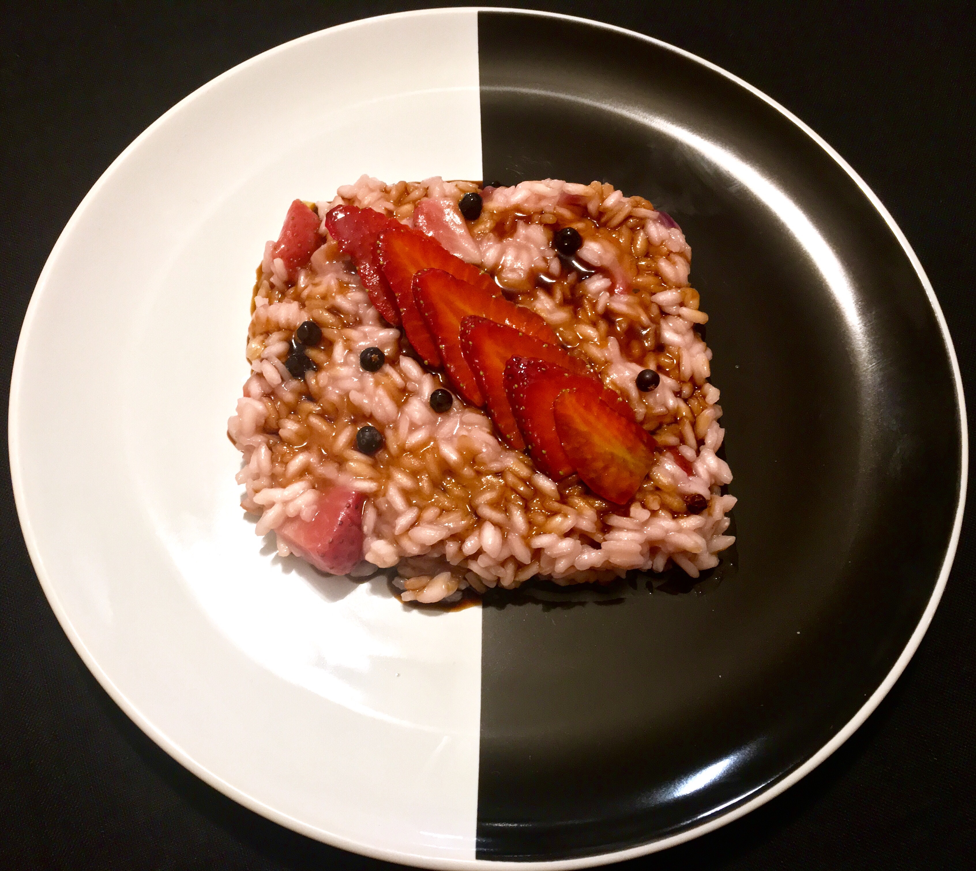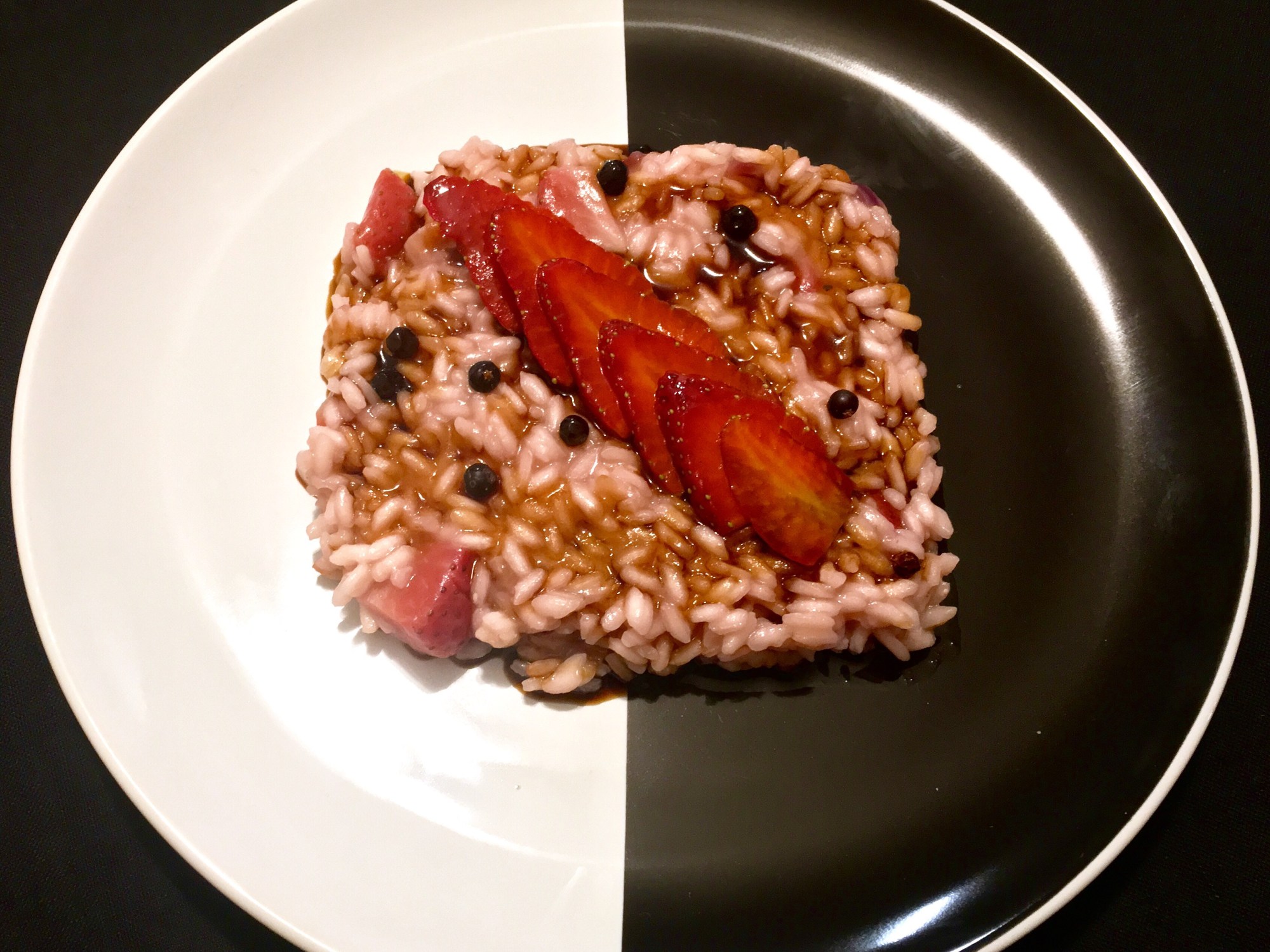 - Tagliare a fettine sottili le due fragole da usare poi per decorare il risotto.