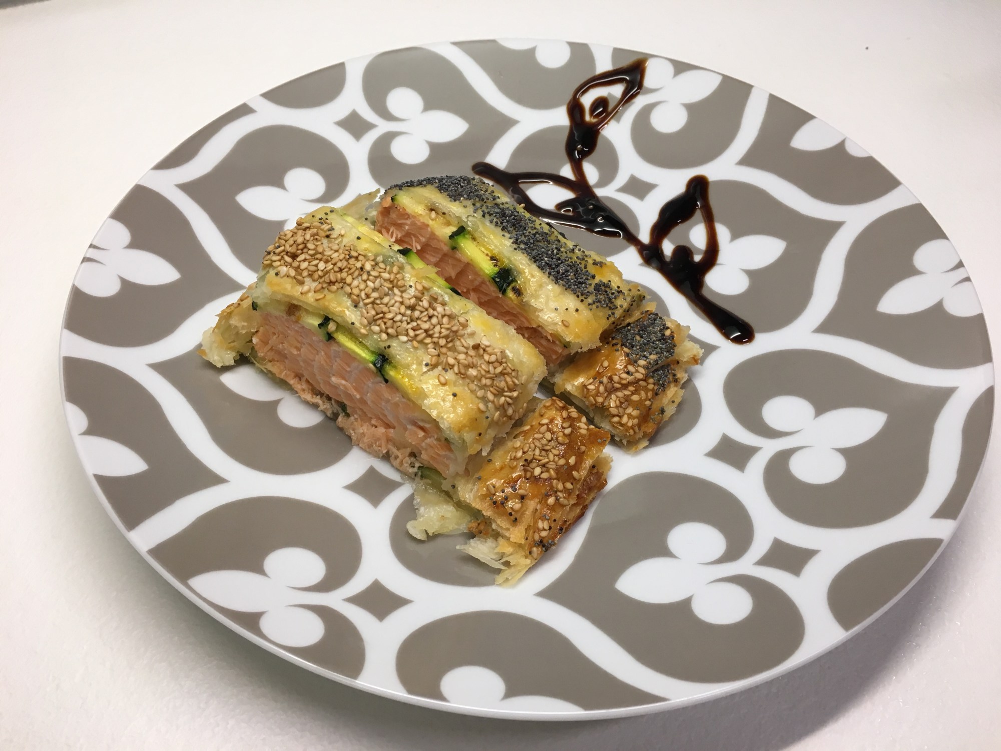- Posizionare nella metà inferiore del rettangolo 2/3 fette di zucchina una accanto all’altra, mettervi sopra il trancio di salmone e adagiare sopra al trancio altre 2/3 fette di zucchina.