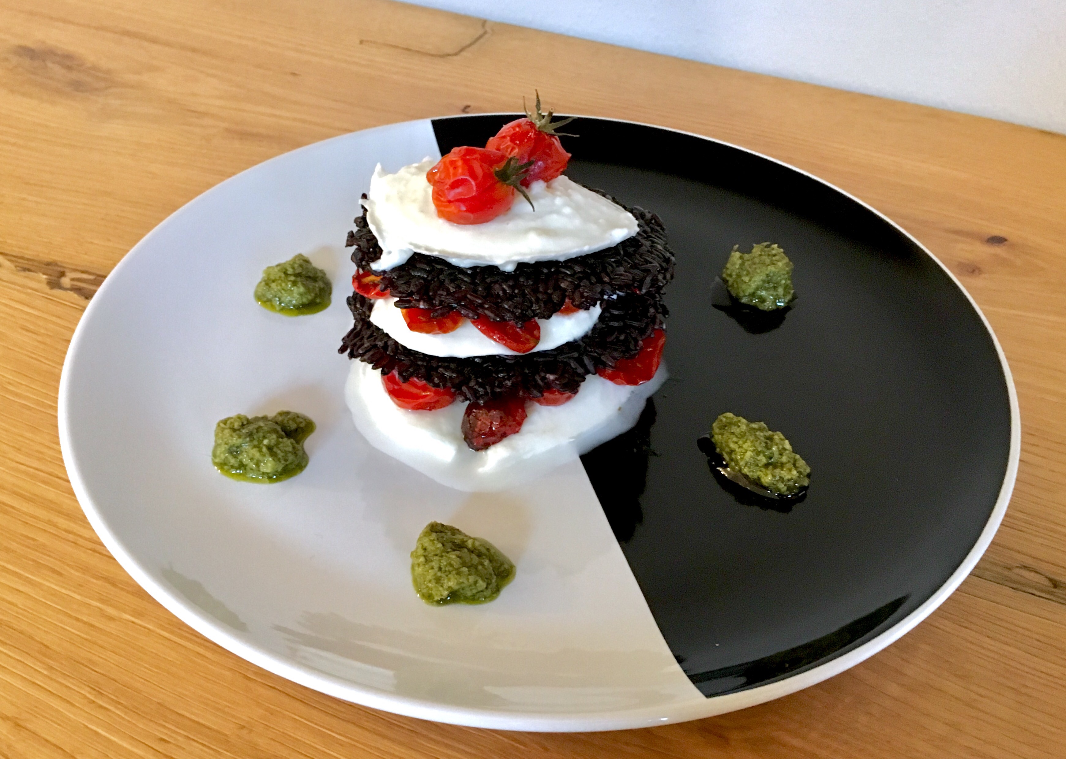 Un piatto con tutti i sapori e profumi dell’estate: la cremosità della mozzarella di bufala, pomodorini dolci come caramelle, riso croccante, il profumo del pesto e la sapidità delle olive taggiasche.