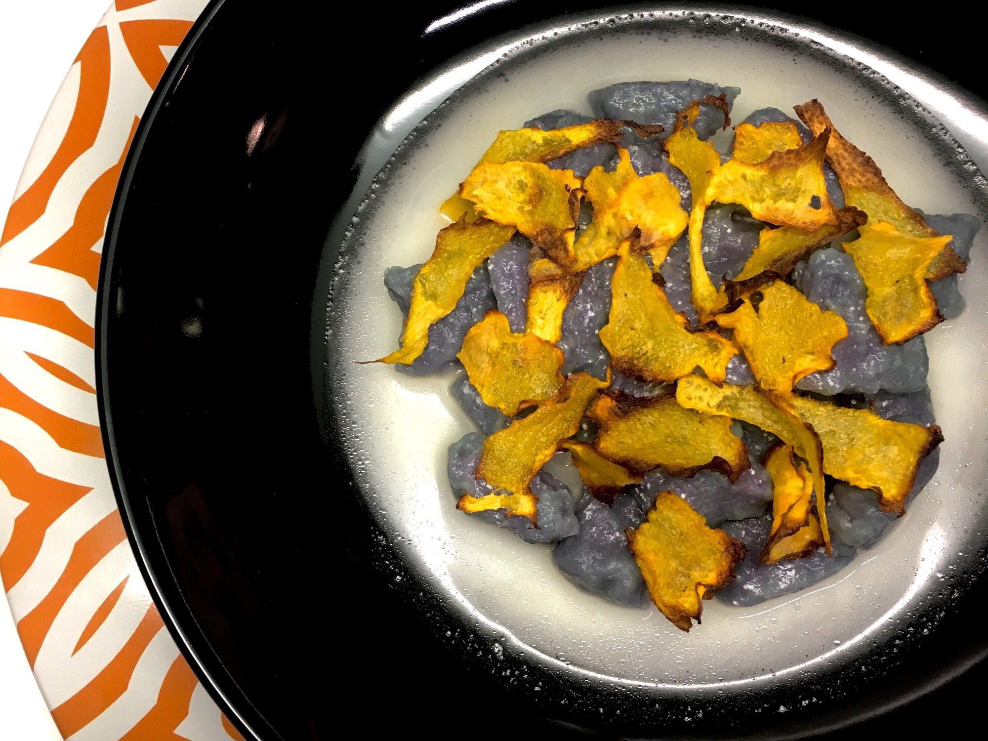 - Servire gli gnocchi versando la colatura di provola e decorando con le chips di Zucca.
