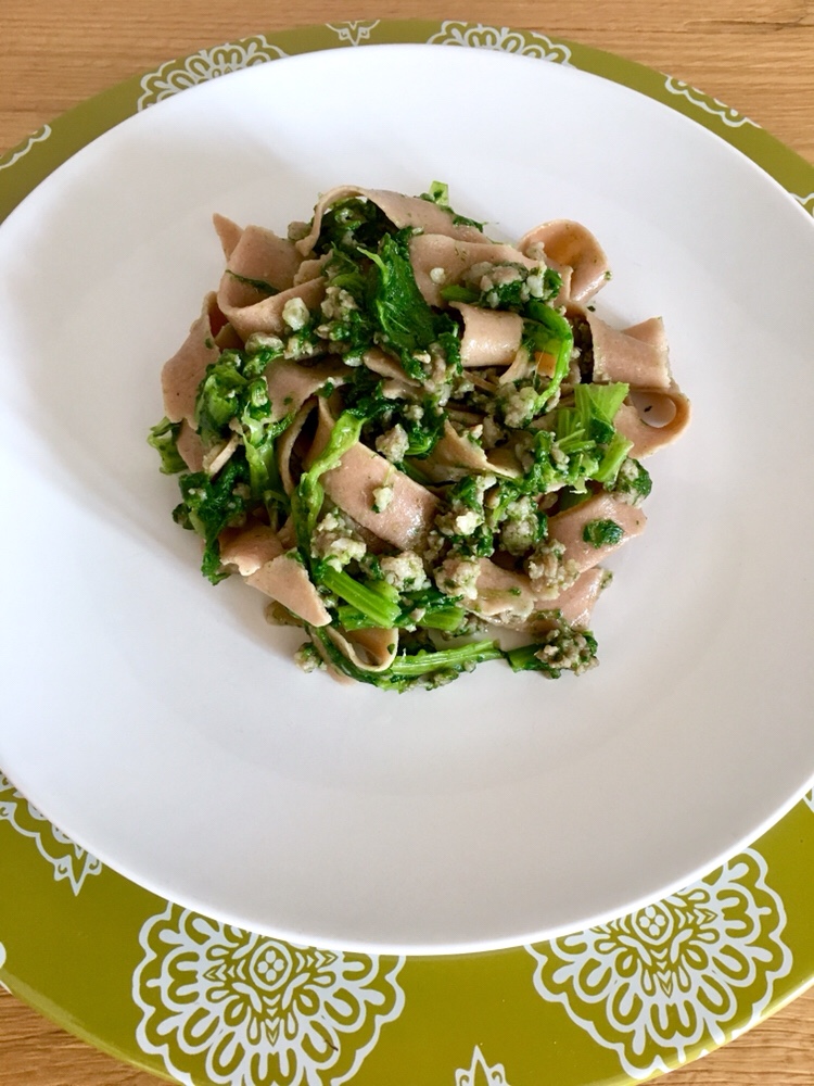- Nel frattempo cuocere le tagliatelle, considerate 140 gr a testa. Sono pronte in 3′, quando vengono a galla controllare la cottura, scolarle e aggiungerle alle cime di rapa.