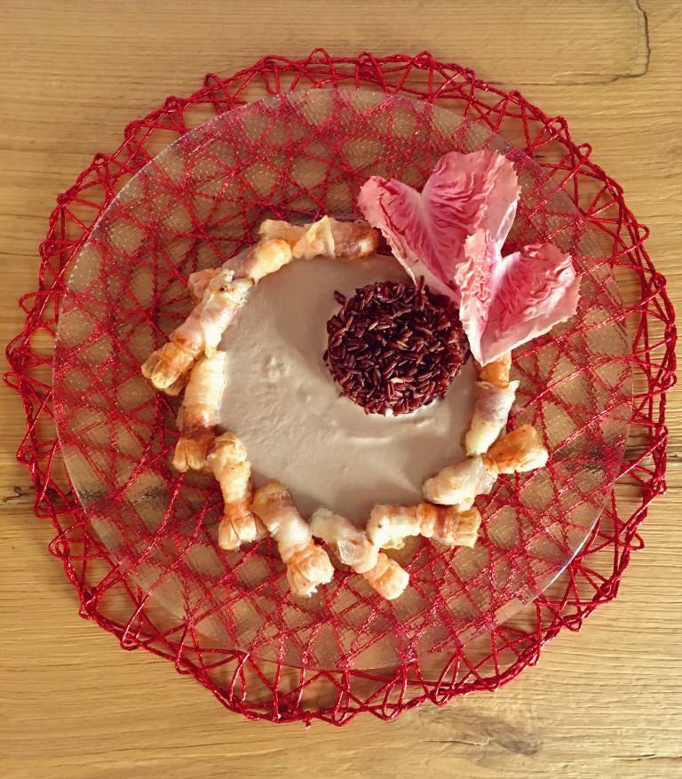 Un’idea per la cena di San Valentino: crostacei dolci e morbidi abbinati al gusto salato del lardo che si sciolgono in bocca e contrastano perfettamente con il sapore amaro del radicchio e la croccantezza del riso rosso integrale.