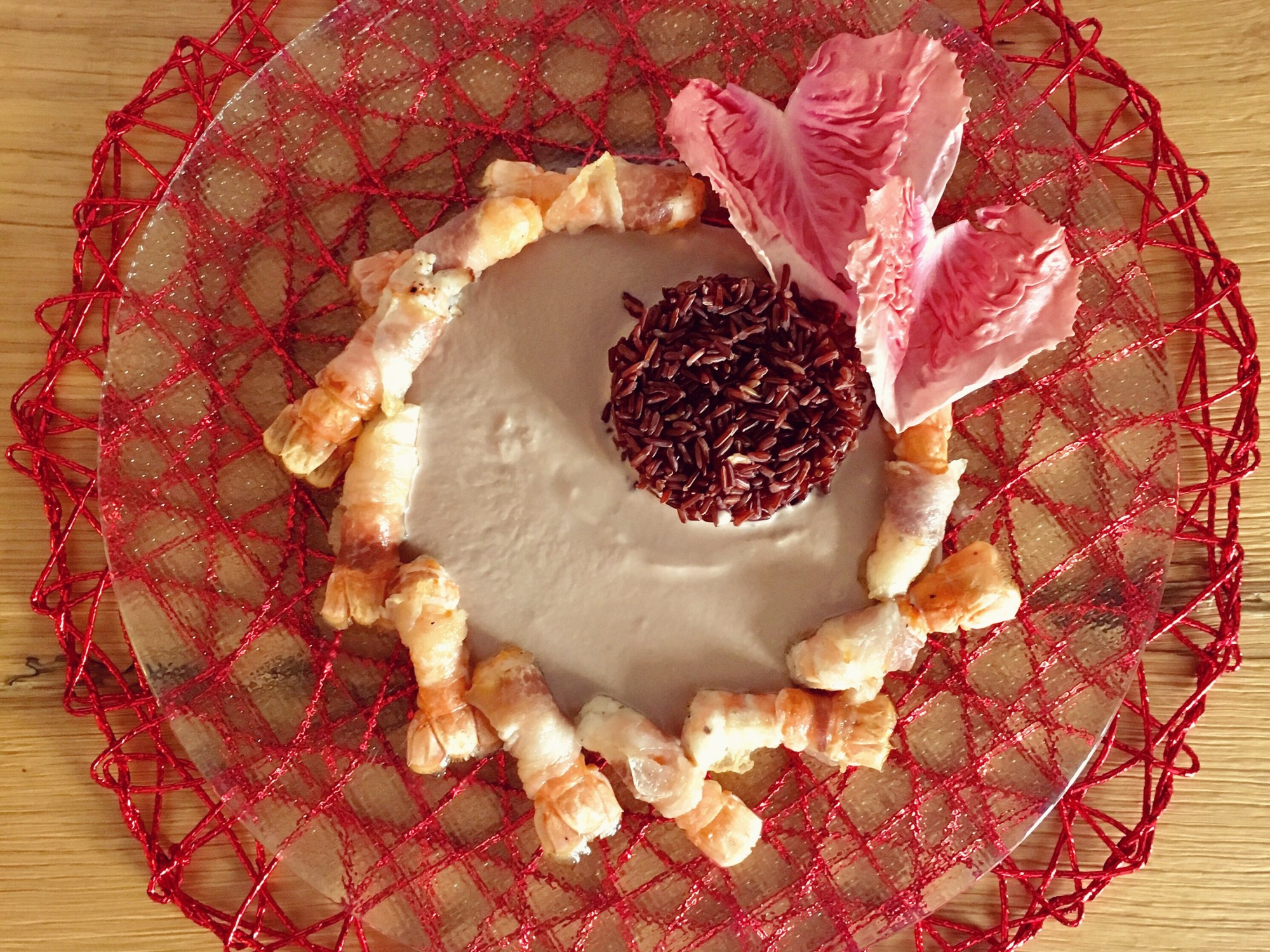 Un’idea per la cena di San Valentino: crostacei dolci e morbidi abbinati al gusto salato del lardo che si sciolgono in bocca e contrastano perfettamente con il sapore amaro del radicchio e la croccantezza del riso rosso integrale.