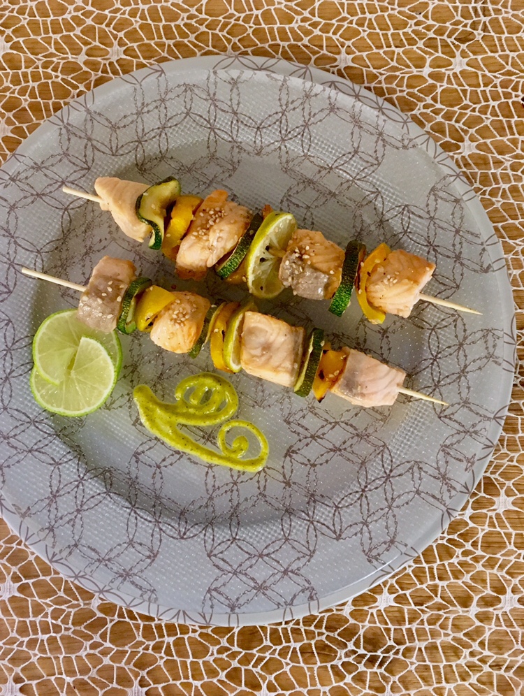 - Comporre gli spiedini alternando salmone, zucchine, peperoni e inserendo al centro una fetta di lime. Cospargerli con i semi di sesamo.