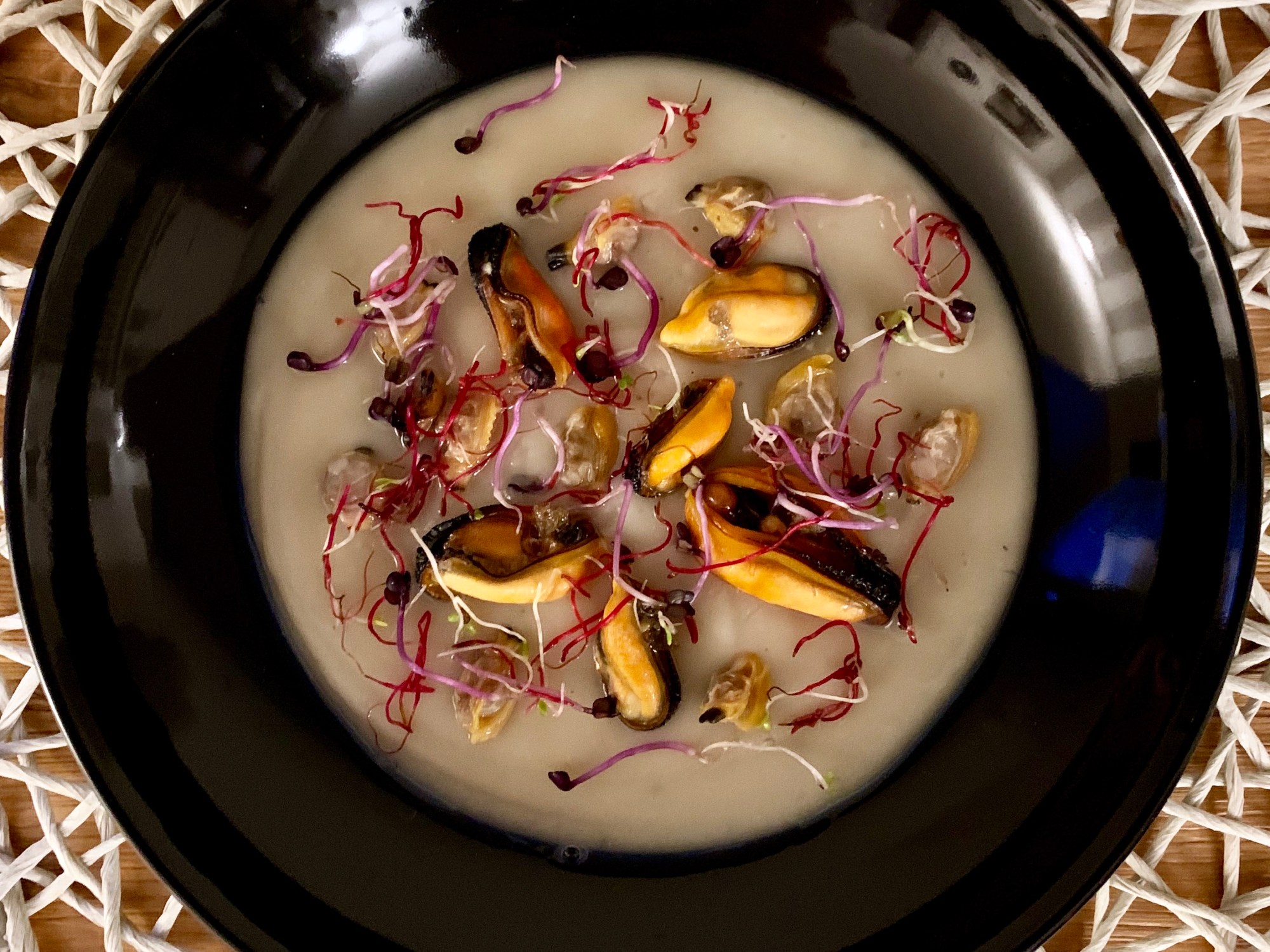 - Nel frattempo sgusciare cozze e vongole. A cottura terminata frullare il topinambur e servire aggiungendo cozze, vongole e germogli.