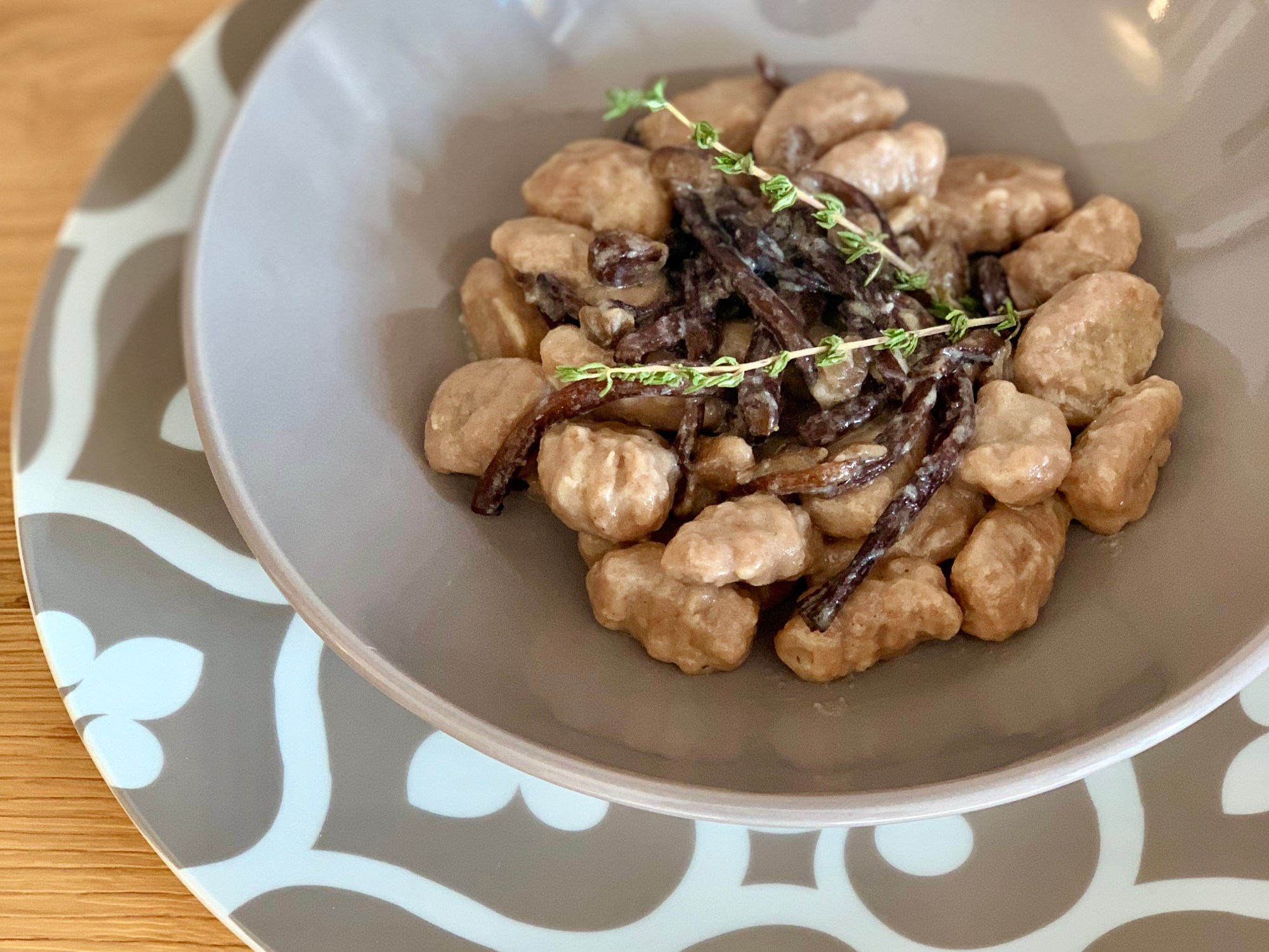 - Pronti gli gnocchi scolarli e saltarli in padella con i funghi, aggiungendo un paio di cucchiai della crema di formaggio e un paio di cucchiai dell’acqua di cottura.