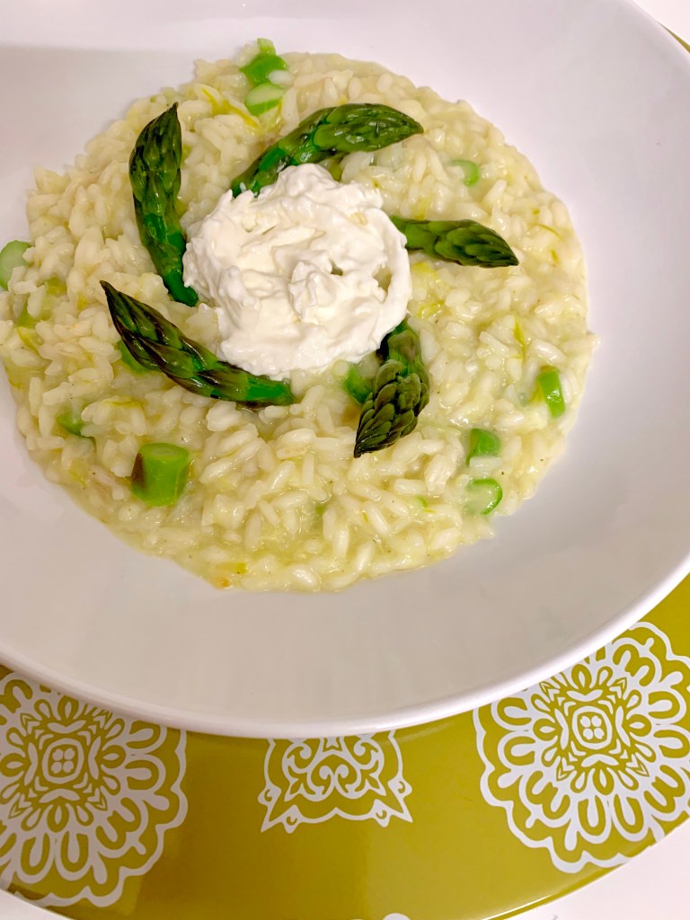 - A metà cottura dopo circa 10 minuti aggiungere al risotto gli asparagi tagliati a rondelle (non le punte).