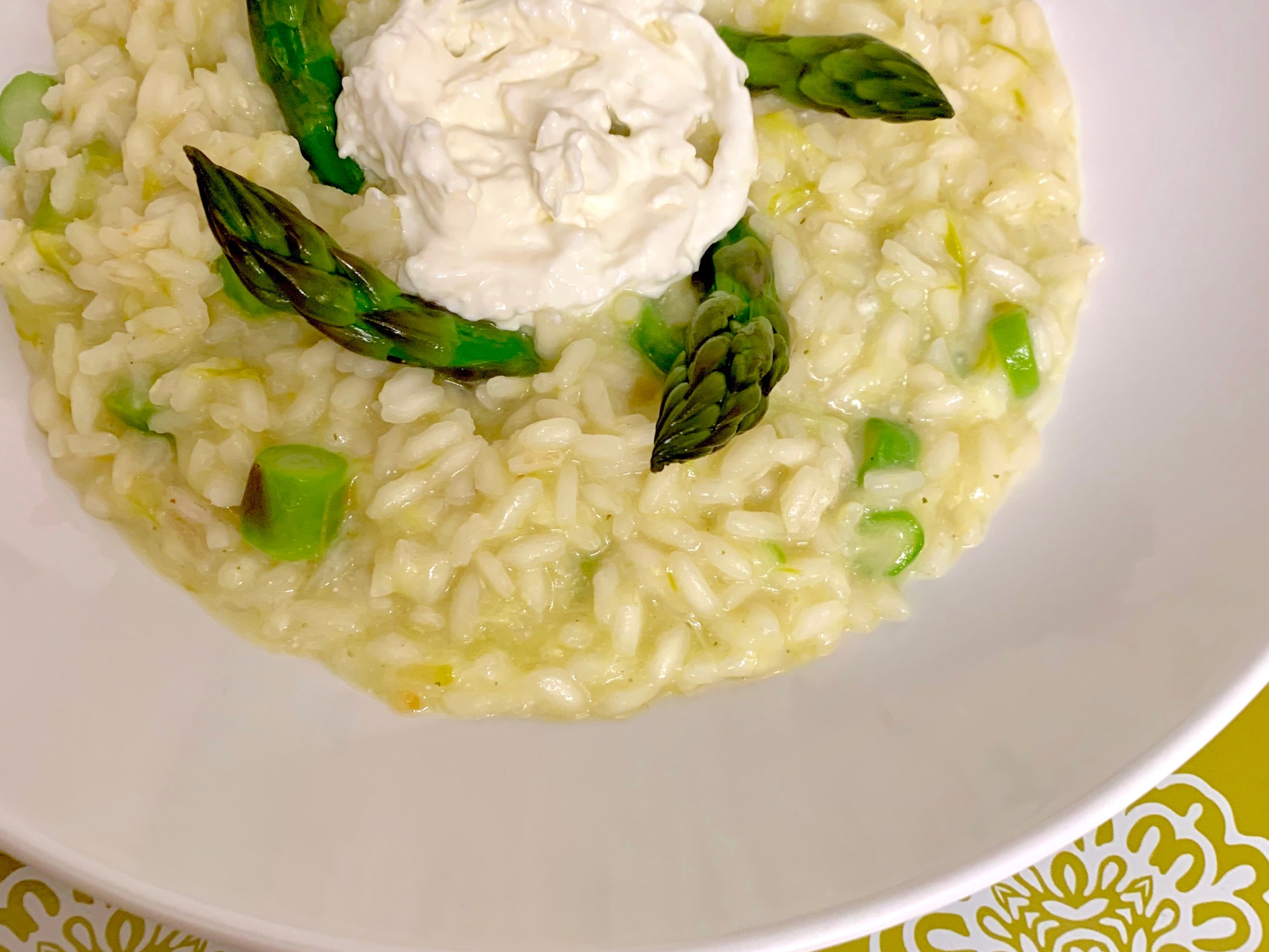 - Scolare i gambi degli asparagi messi nel brodo vegetale e frullarli con un cucchiaio di acqua di cottura, aggiungere la crema al risotto.