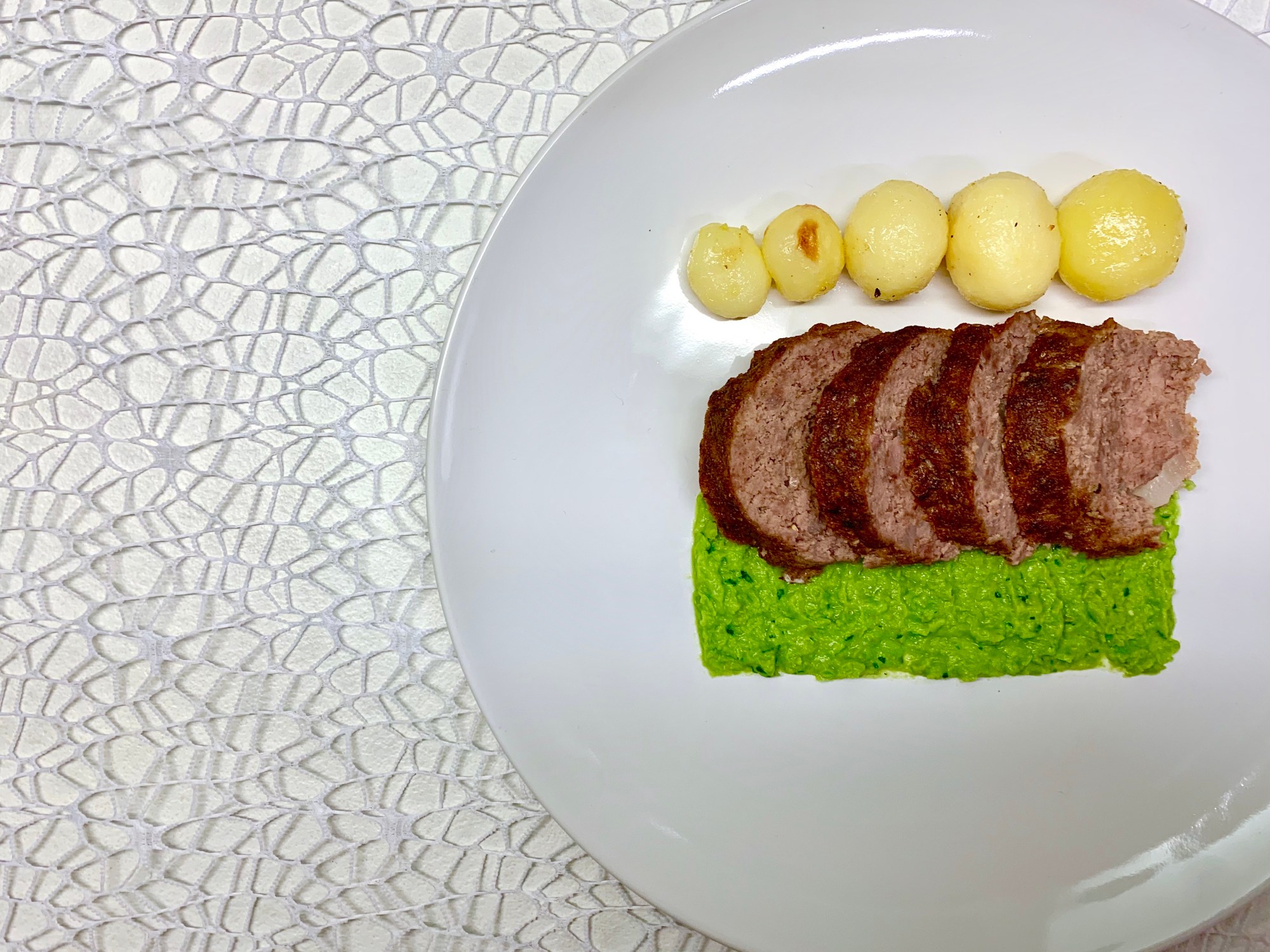 - Servire il polpettone a fette con le patate (da salare) e l’hummus.