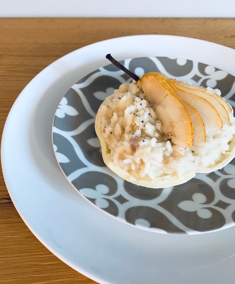 - A 5 minuti dalla fine della cottura aggiungere la pasta di tomino e le pere.