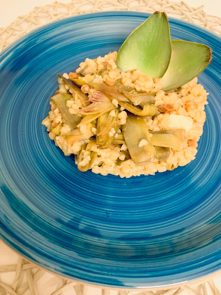 - Aggiungere i carciofi con il loro sugo di cottura, il brodo a filo continuare la cottura per circa 15 minuti aggiungendo brodo se serve man mano. Non dovrà risultare brodosa.