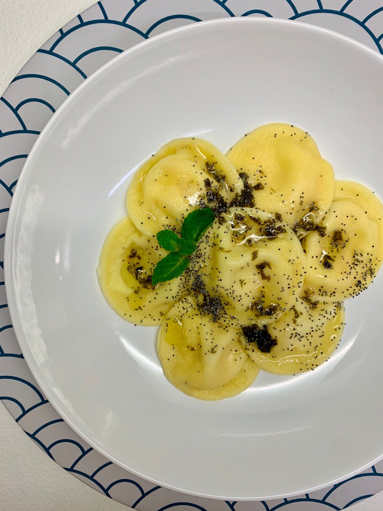 - Cuocere i ravioli per circa 5 minuti dalla ripresa del bollore e quando pronti scolarli delicatamente nella padella con il condimento per un paio di minuti, coprendoli con la salsa (=nappare). Io ho aggiunto anche dei semi di papavero!