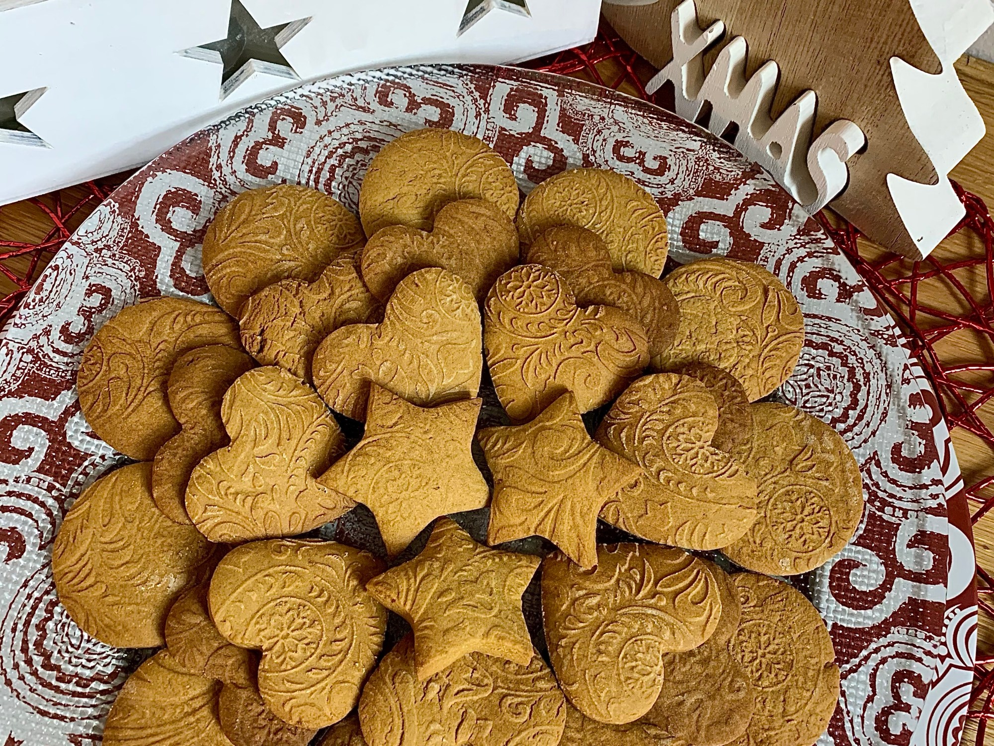 Ecco la ricetta dei famosi biscotti speziati di Natale! In linea di massima le ricette che trovate in rete sono tutte più o meno simili, leggere variazioni di burro o zucchero e della quantità di spezie in base ai gusti, ma l’impasto base è pressoché invariato. Io non amo particolarmente la glassa o la ghiaccia reale che si usa per decorare i biscotti di Natale, quindi mi sono attrezzata con un matterello in legno inciso con delle decorazioni, per ottenere dei biscotti già decorati senza usare nessuna glassa.