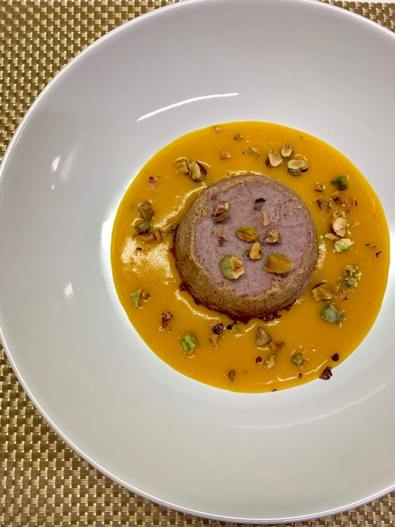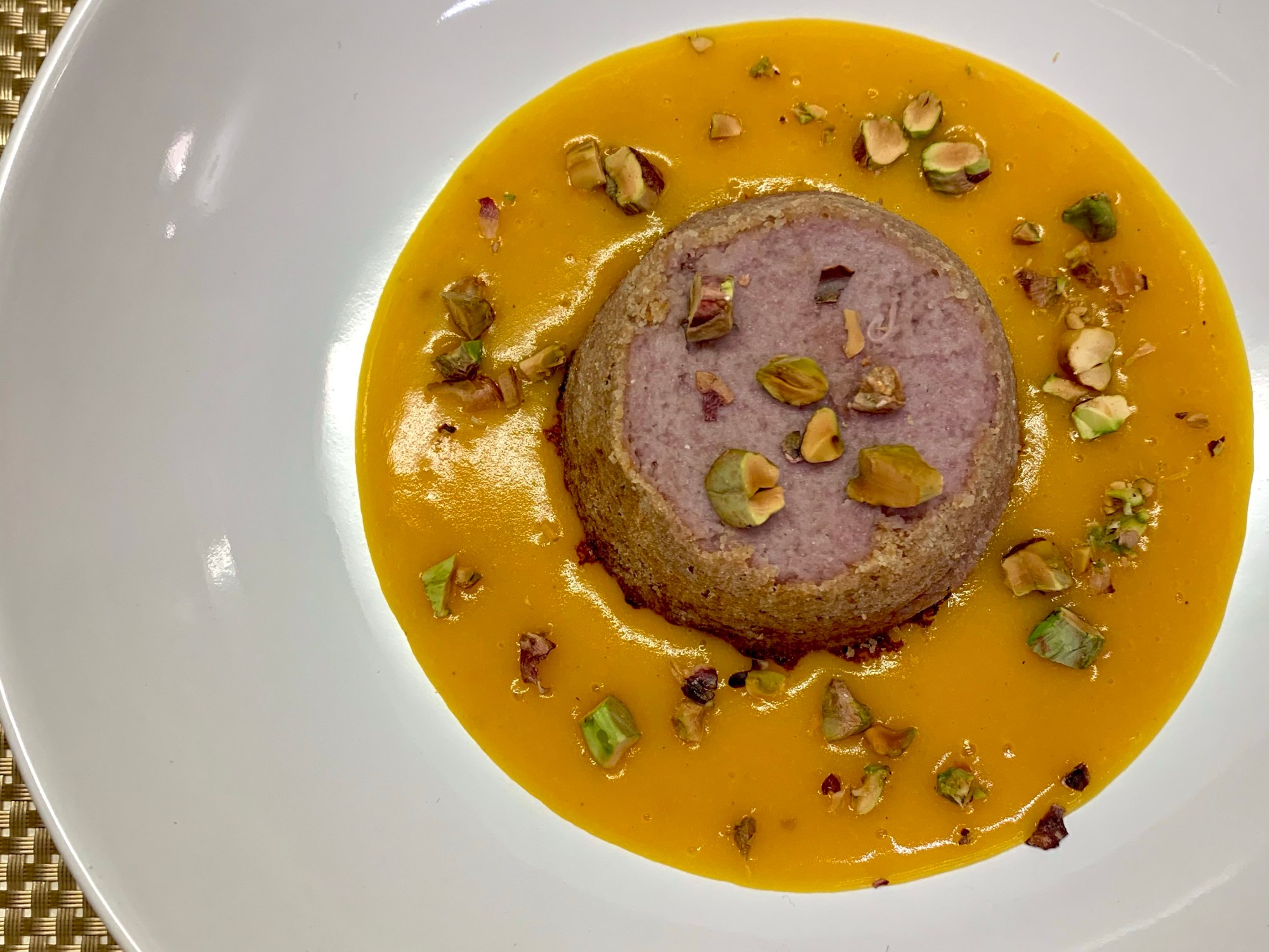 - A cottura terminata, frullate con un minipimer e preparate la crema come base nei piatti, sfornate il tortino che ormai sarà pronto e servitelo sopra la crema con la granella di pistacchi!