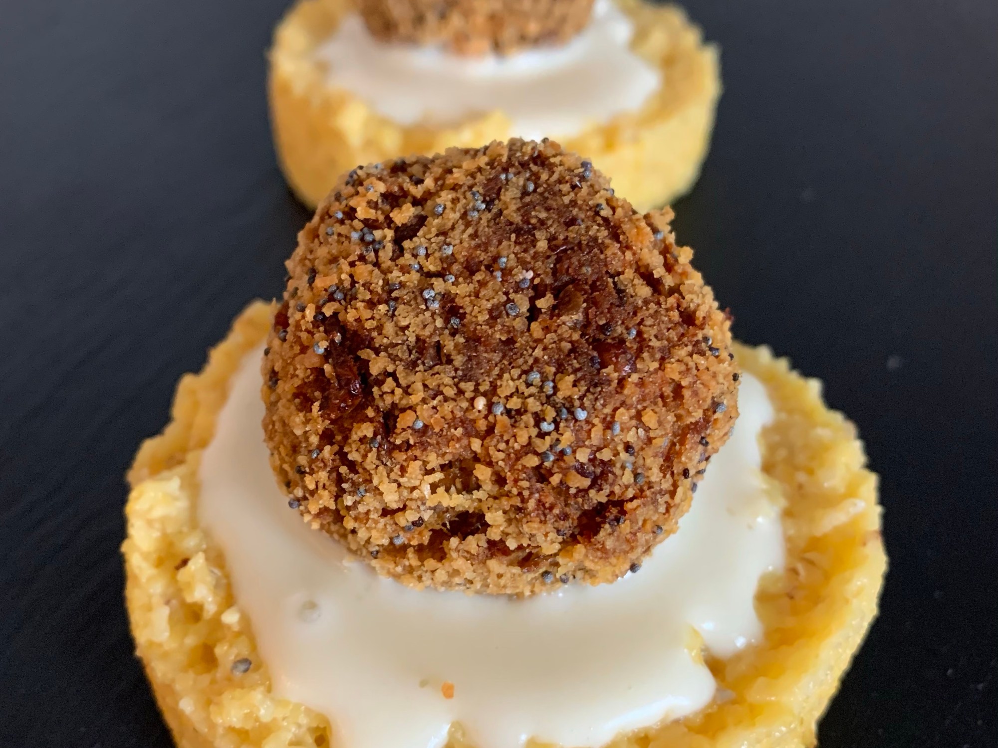 - Impiattate la vostra polenta, versatevi sopra la crema e poi le polpettine!