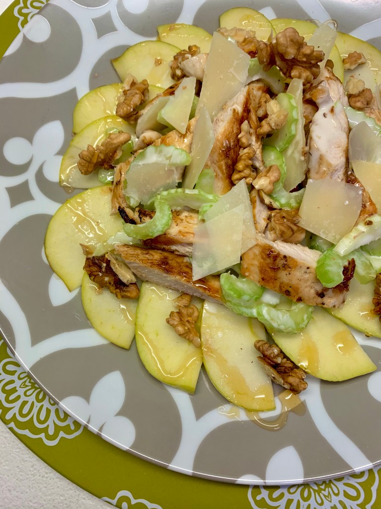 - Disponete il pollo con io sedano al centro del piatto e delle mele, con le scaglie di grana.a