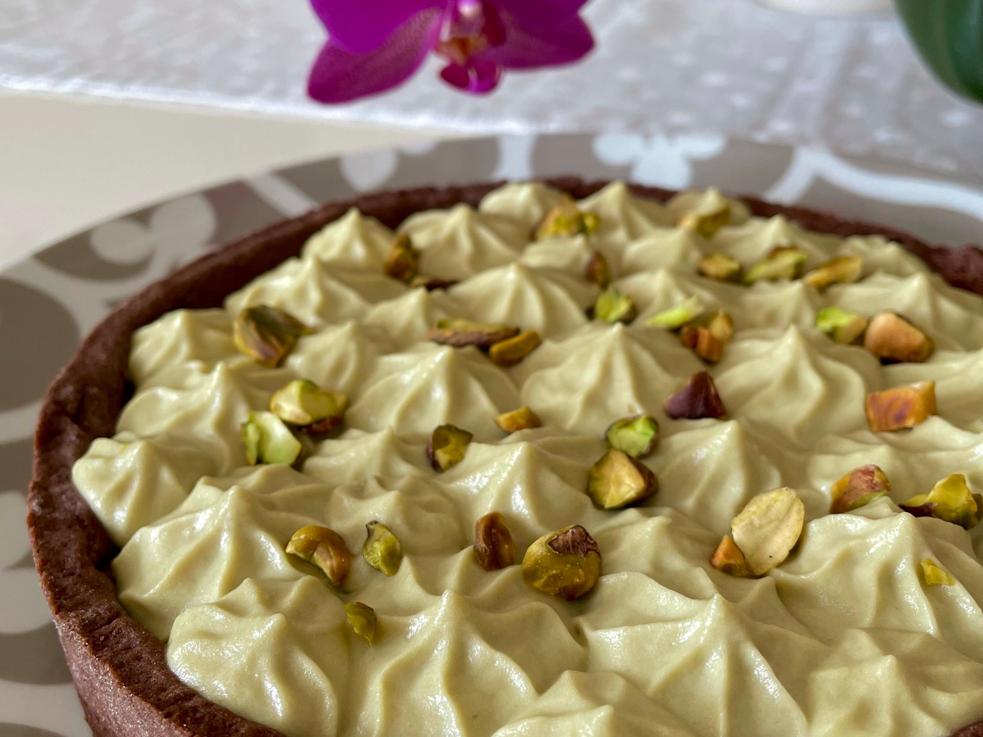 Ho preparato questa crostata per il pranzo di Ferragosto: volevo una torta semplice e fresca ma senza fare la solita cheesecake fredda. Quindi ho pensato di preparare un guscio di frolla al cacao e farcirla con una mousse facilissima e leggera, preparata solo con panna montata e crema al pistacchio!