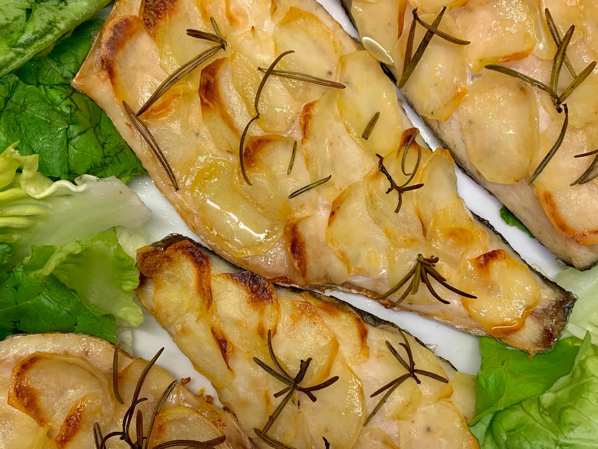 - Salate, pepate e nuovamente condite con un filo di olio i filetti coperti di patate , aggiungendo degli aghi di rosmarino fresco.