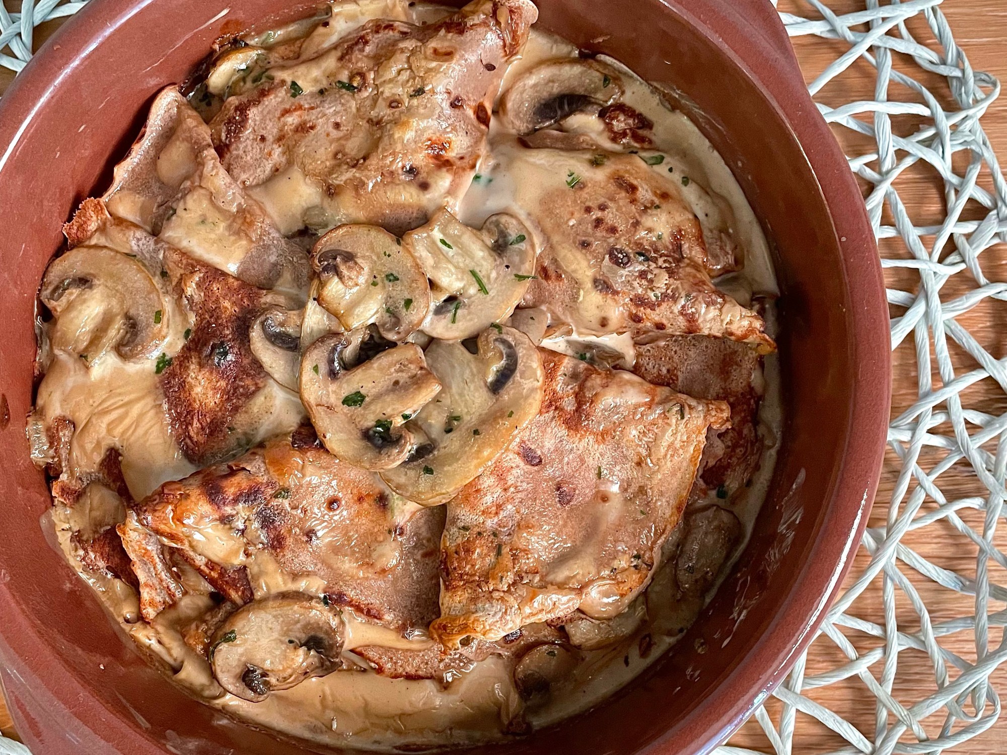 - Distribuite sopra le crespelle la panna avanzata e eventuali funghi che non avete messo nelle crespelle.