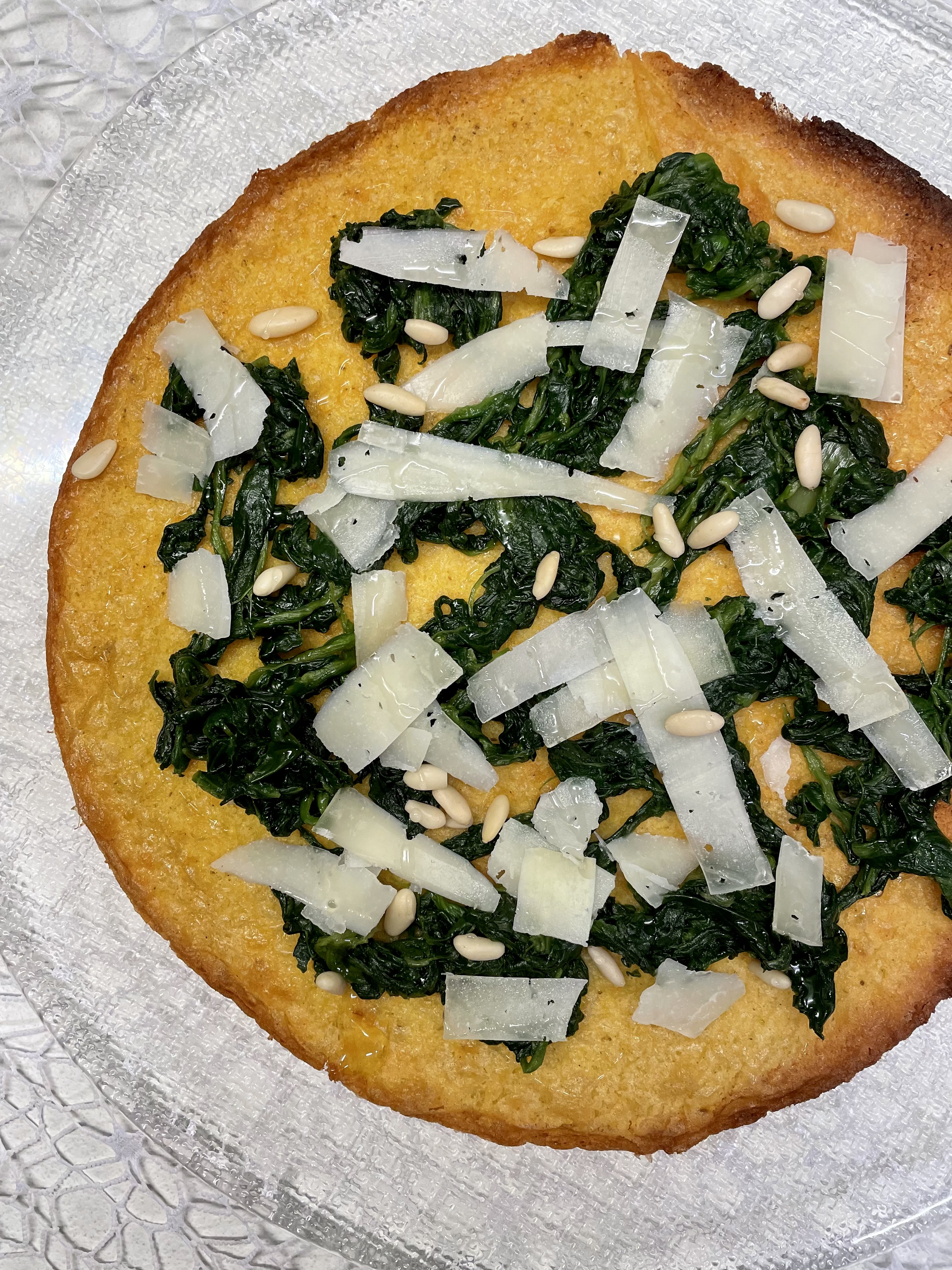- Sfornate la farinata e condite con spinaci, pecorino, pinoli e un filo di miele!