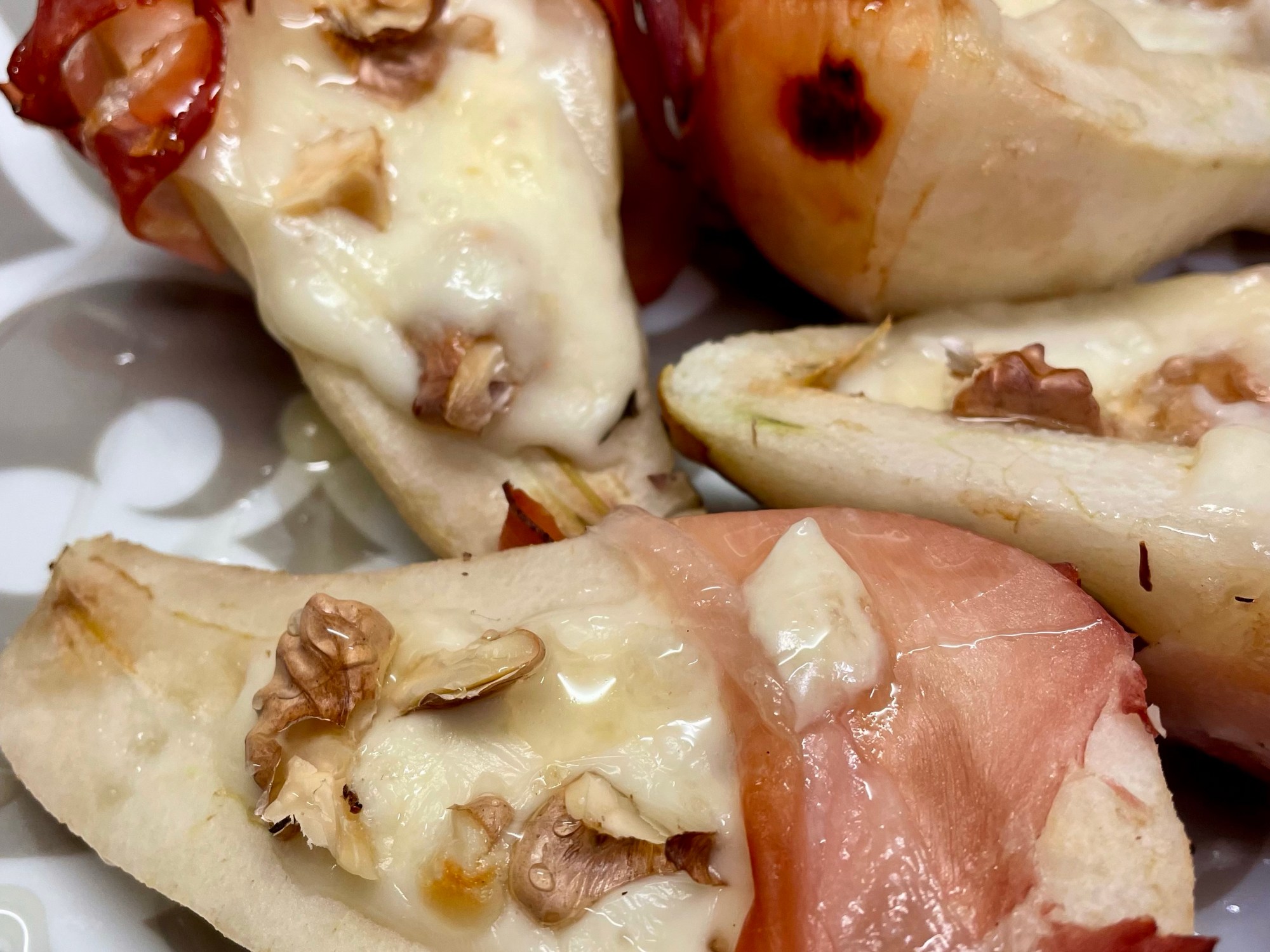 5. Avvolgete la parte inferiore della pera con una fetta di speck. Disponete in una teglia.