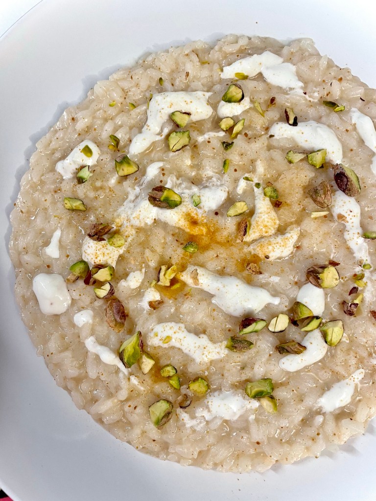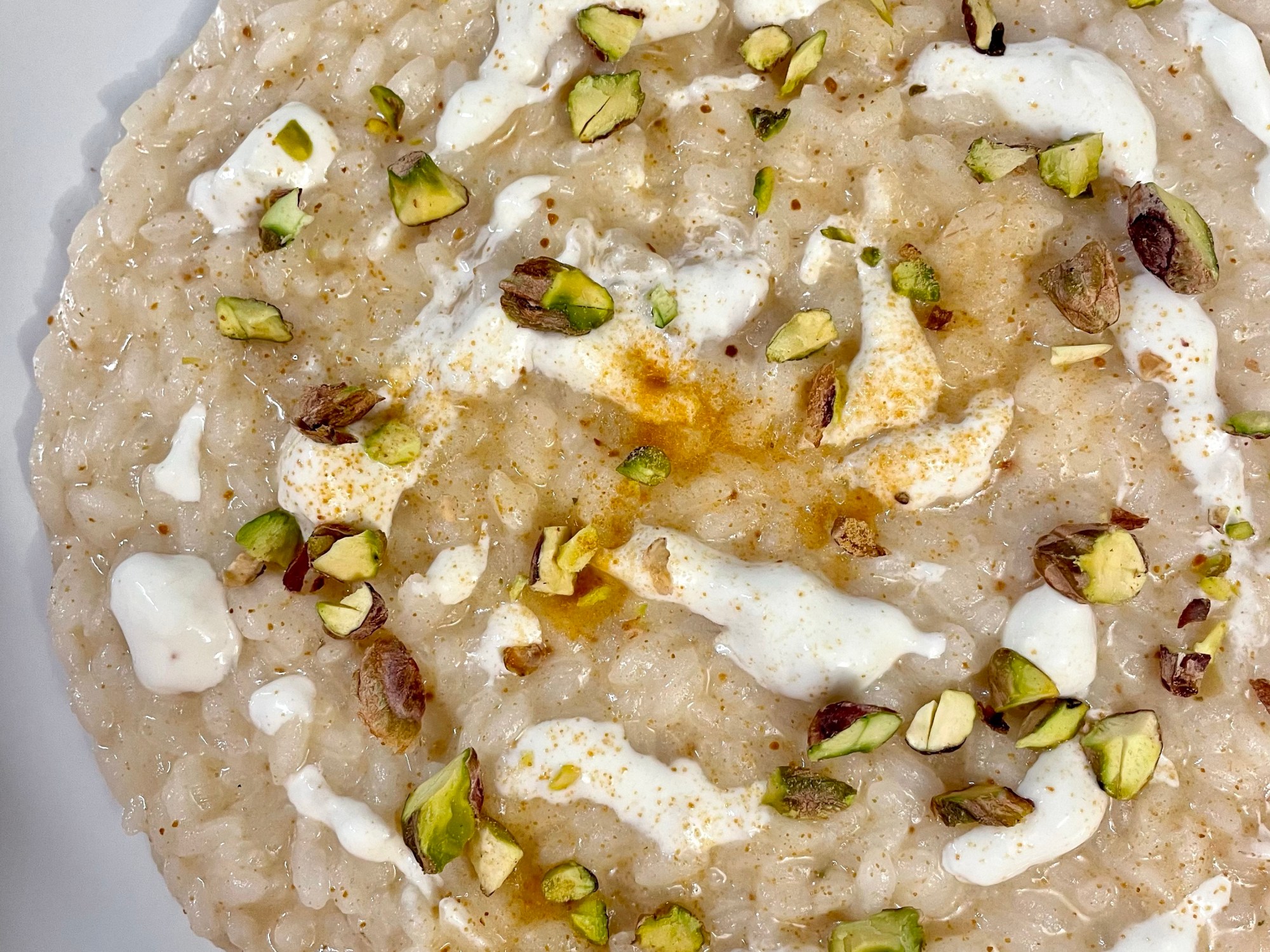 4. Terminata la cottura del risotto, mantecatelo con la stracciatella, tenendone un paio di cucchiaini da parte per guarnire.