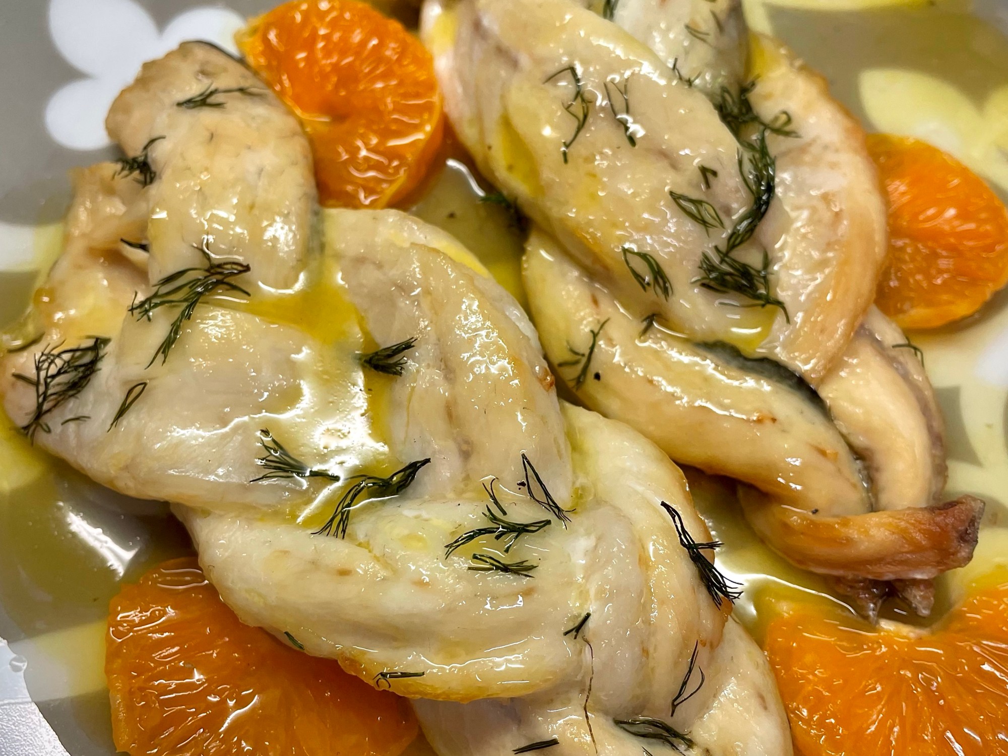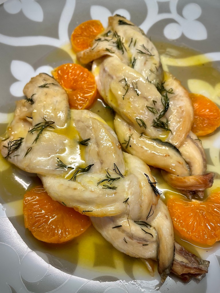 6. Componete il piatto: posizionate due trecce per piatto, qualche fetta di mandarino, condite versandovi sopra l’emulsione di mandarino e un pizzico di sale.
