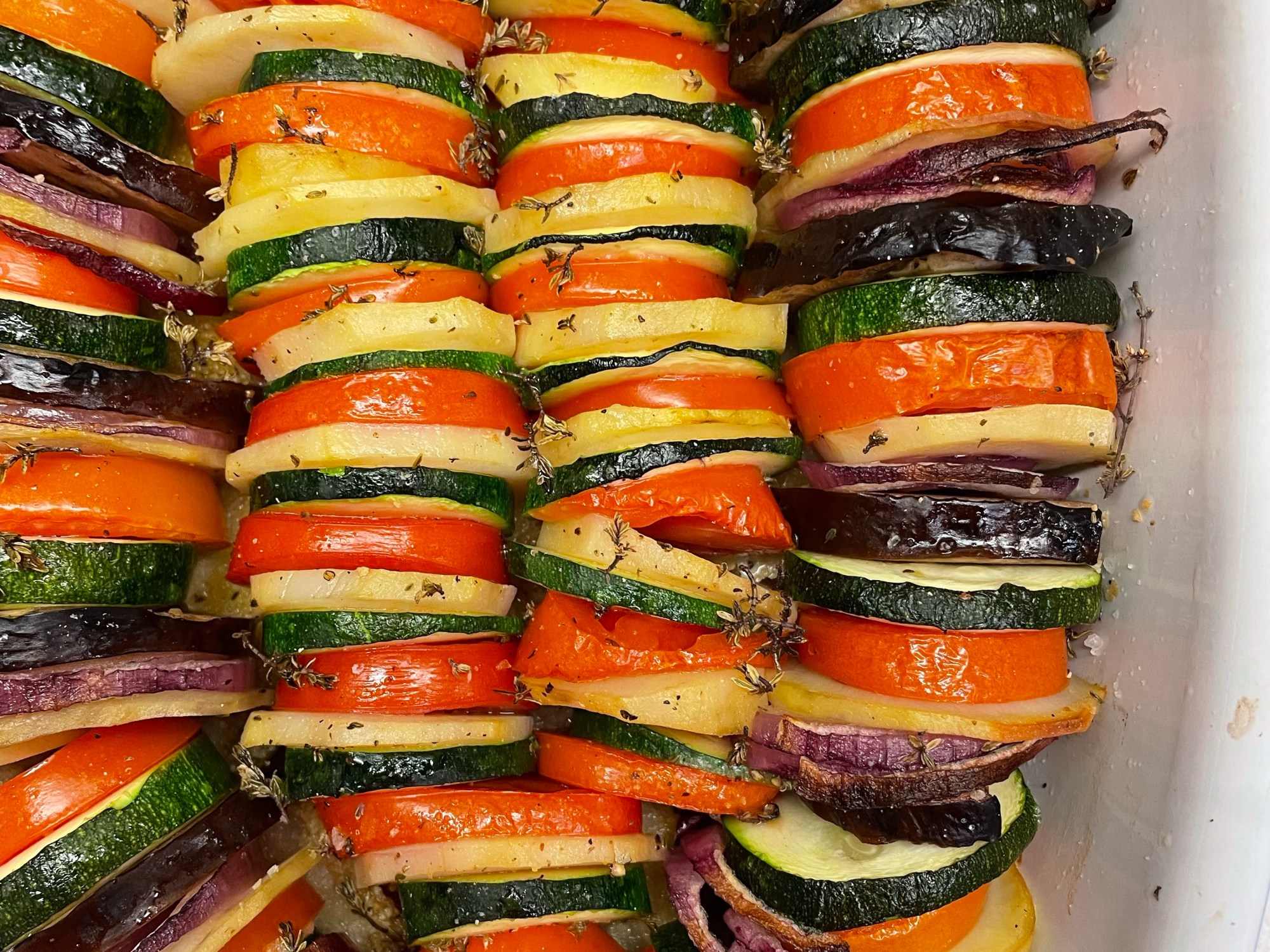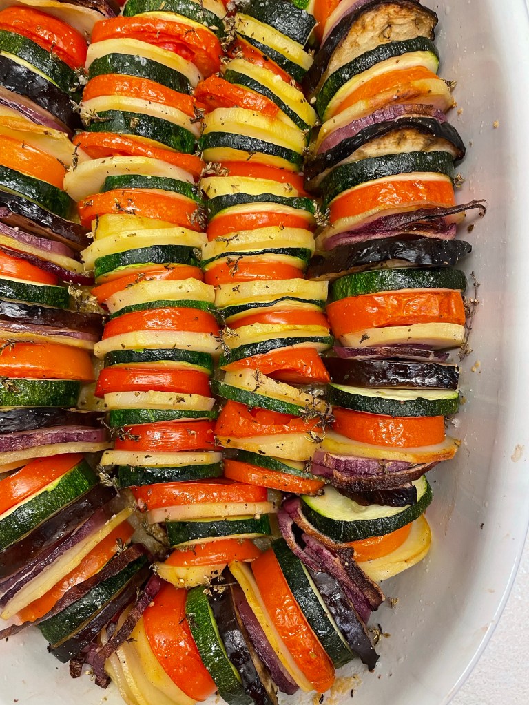 La cosa fondamentale per un tian bello da vedere è trovare verdure che abbiano le stesse dimensioni, in modo da ottenere delle fette con una circonferenza quasi identica e creare una spirale il più possibile omogenea, come nella foto! Se così non fosse non preoccupatevi, sarà comunque buonissimo 🙂