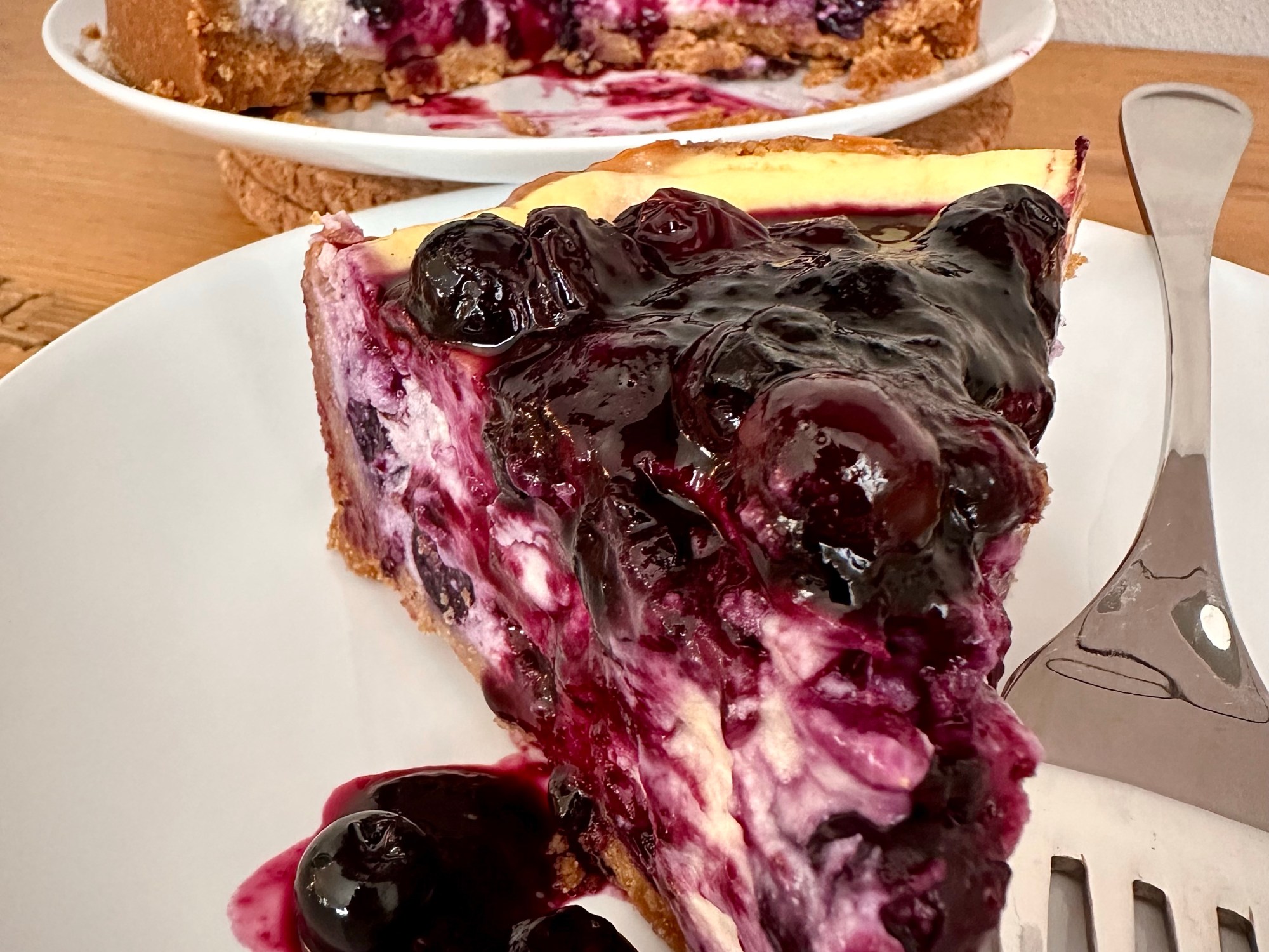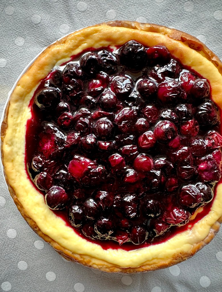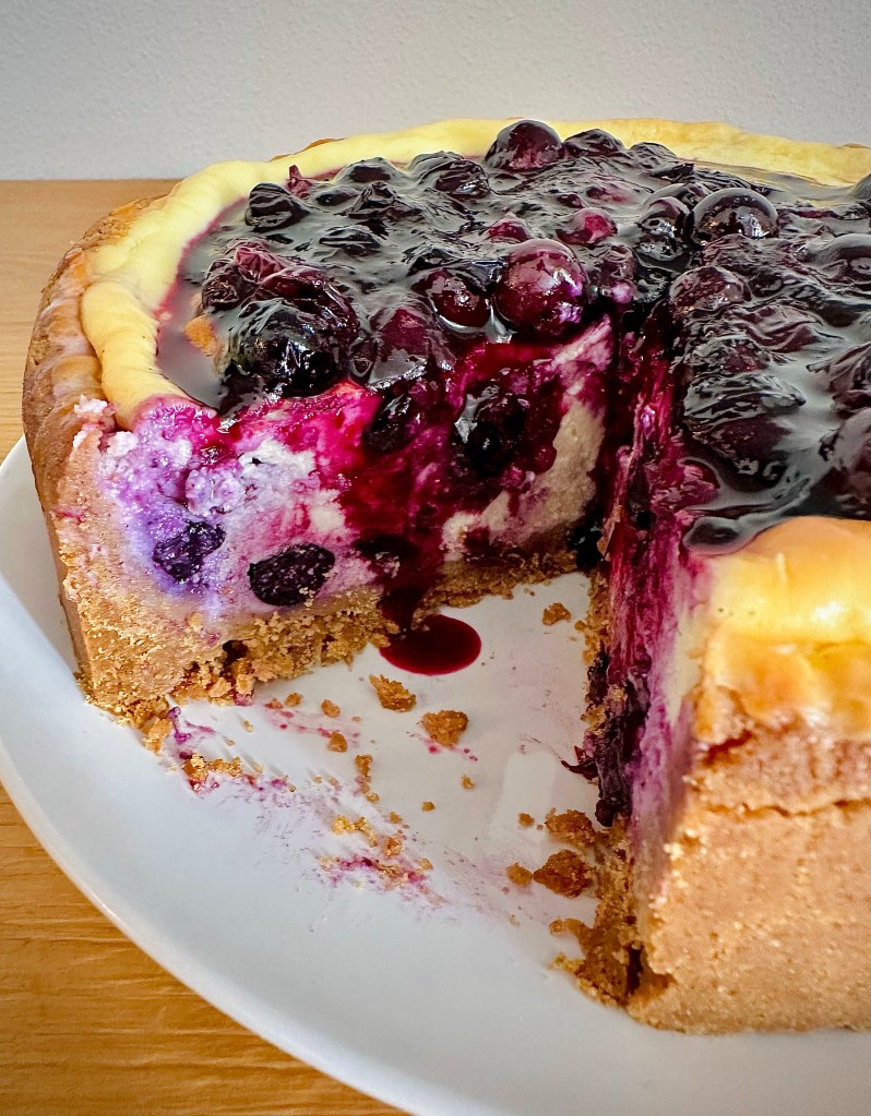 14. Ora potete finalmente rimuovere la vostra cheesecake dalla teglia e versarvi sopra lo sciroppo di mirtilli! Si conserva in frigo per 3 giorni, ben coperta, ma finirà prima 😇