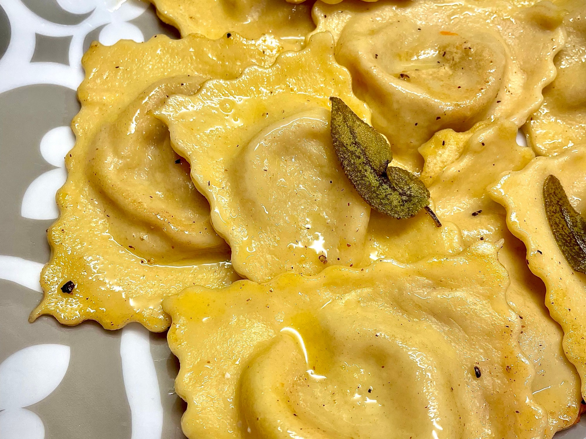 10. Portate a ebollizione una pentola di acqua e cuocete i ravioli per 6/7 minuti circa. Nel frattempo fate sciogliere in una pentola antiaderente il burro con la salvia, aggiungete un po’ di pepe e noce moscata e quando saranno pronti i ravioli scolateli e saltateli in padella un paio di minuti.