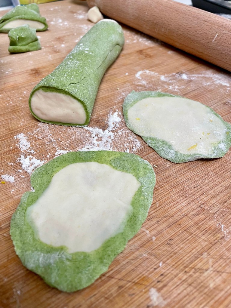 7. Riprendiamo l’impasto: usando un matterello stendete quello verde per ottenere una sfoglia rettangolare fine. Lavorate l’impasto bianco per dargli la forma di un cilindro e avvolgetelo con l’impasto verde. Bagnatevi le dita con dell’acqua: aiuterete la sfoglia verde ad aderire bene a quella bianca!