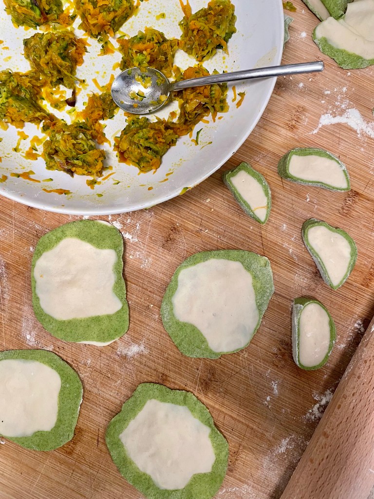 10. Posizionate al centro di ciascun dischetto di impasto un cucchiaino del ripieno di verdure, chiudetelo a mezzaluna e pizzicate leggermente i bordi sovrapponendoli, per avere una chiusura decorata come in foto.