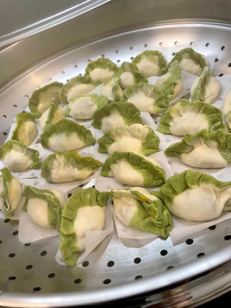 11. Posizionate man mano i ravioli su un piatto coperto di carta forno. Una volta pronti, preparate la vaporiera: portate a ebollizione l’acqua non salata e poi inserite il cestello.