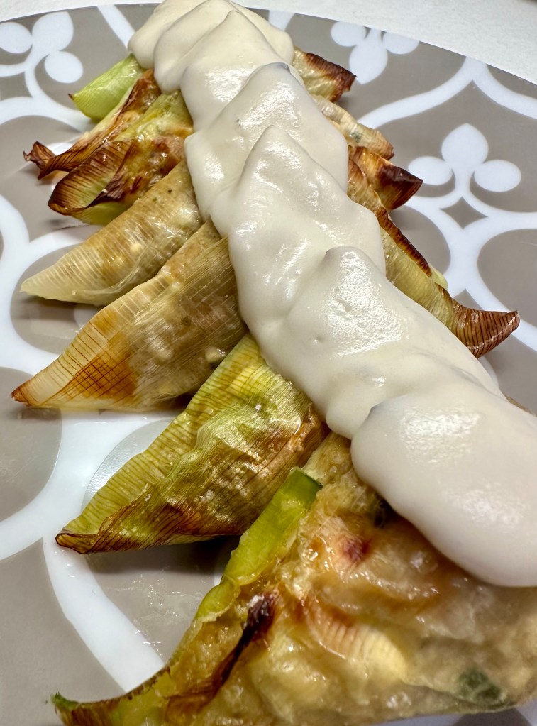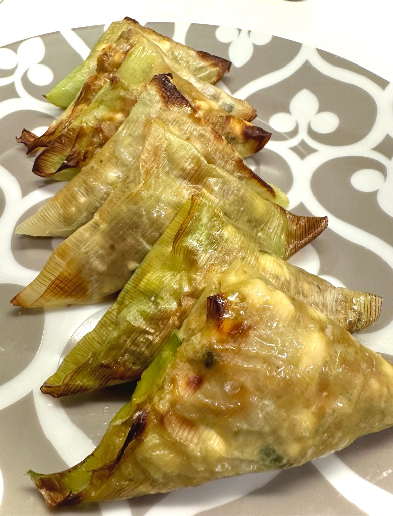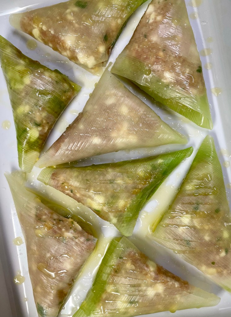 Inizialmente volevo preparare dei fagottini di porri vegetariani, ripieni di patate e formaggio, poi come sempre la gestione anti spreco della dispensa mi ha fatto cambiare idea e, dovendo consumare della carne trita, ho virato su un ripieno di carne. Ho scelto la feta come formaggio per il ripieno, per avere un bel contrasto leggermente acidulo con la delicatezza del porro.