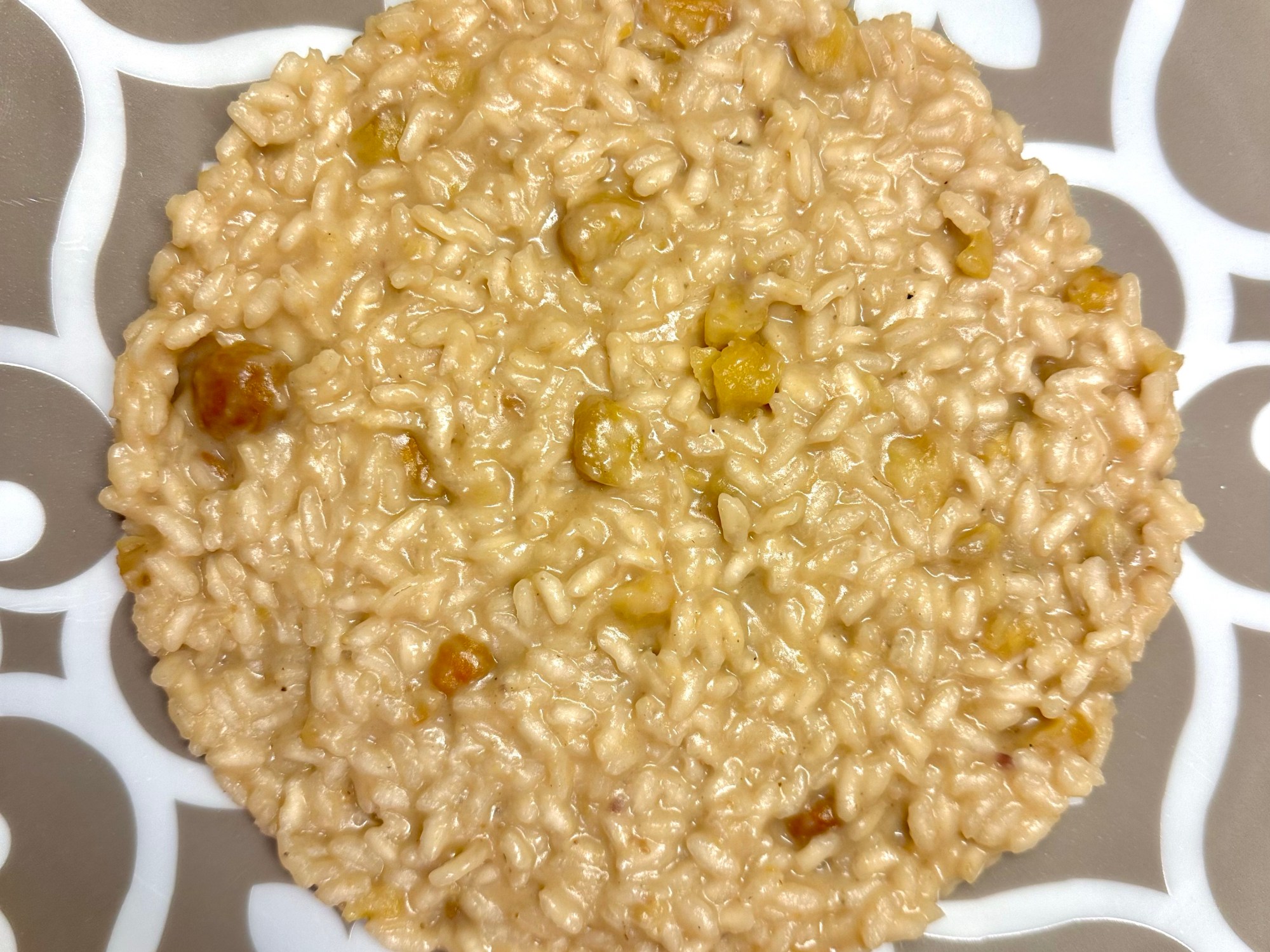 5. Portate a cottura il riso aggiungendo il brodo man mano. 5 minuti prima della fine della cottura aggiungete la crema di castagne e un pizzico di pepe.