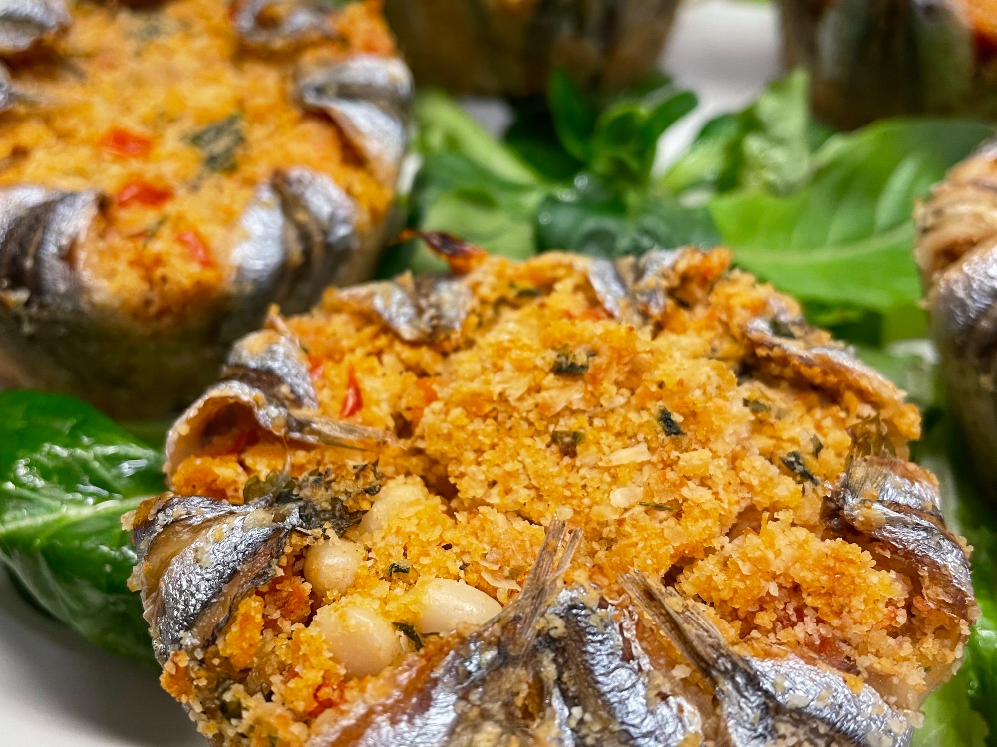 5. Farcite con il ripieno pressandolo bene con un cucchiaio, ripiegate le code delle alici verso il centro come a chiudere il tortino, schiacciandole per farle aderire bene alla superficie.