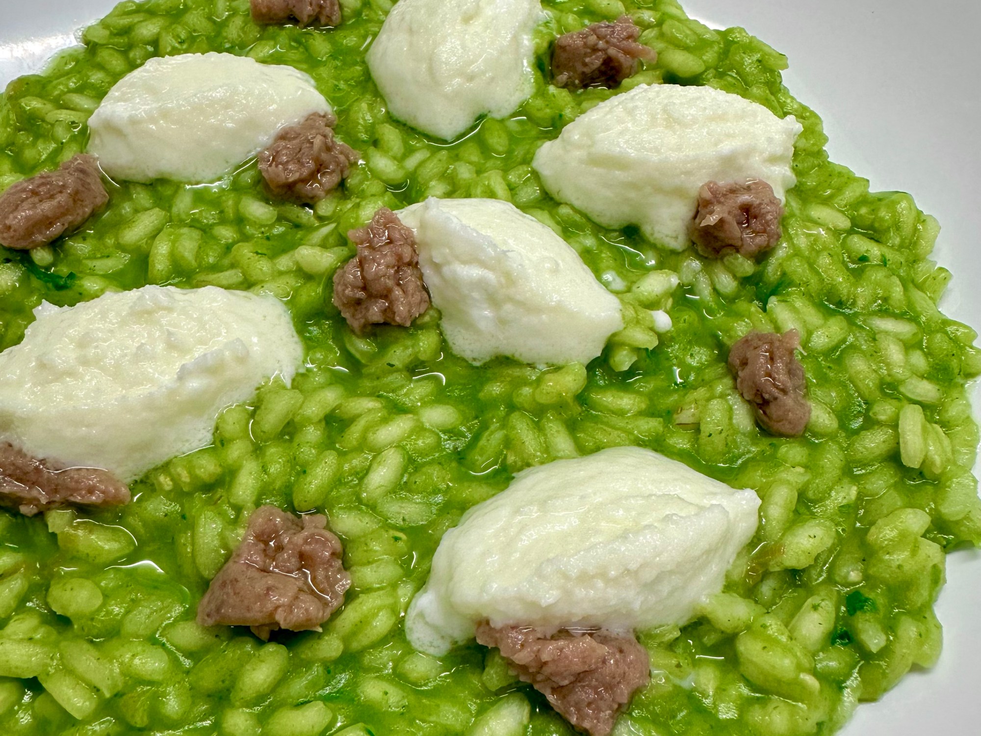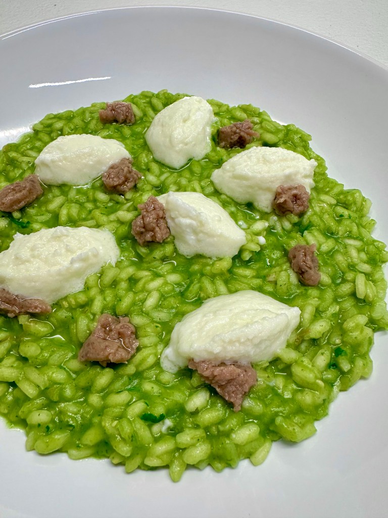 9. Impiattate disponendo sopra al risotto delle gocce di salsa alle alici e qualche quenelle di mousse, aiutandovi con due cucchiaini.