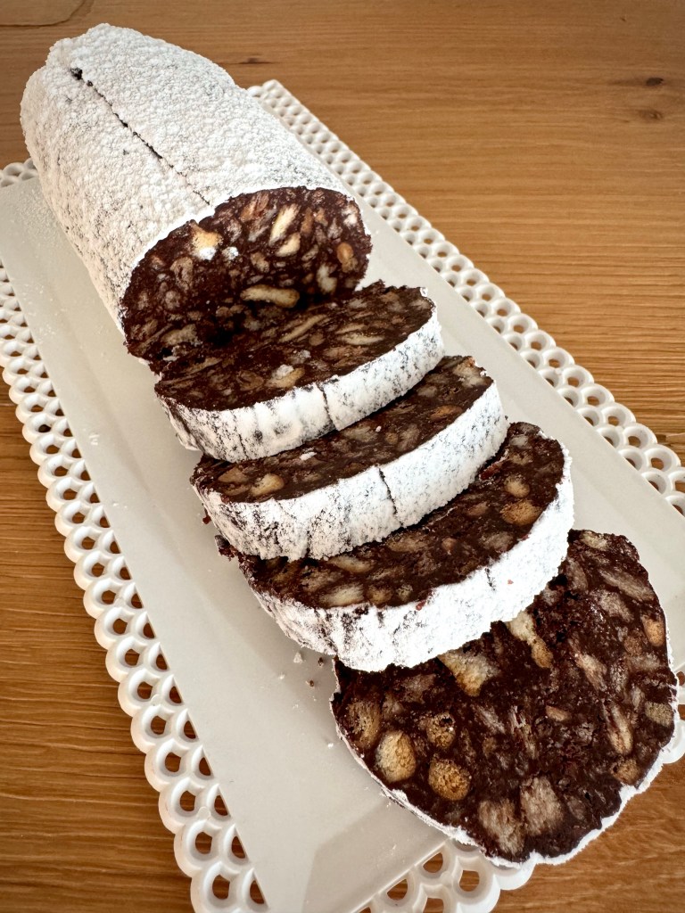 2. Nel frattempo tritate grossolanamente i biscotti usando un coltello. Non devono essere sbriciolati troppo fini, si devono vedere i pezzi all’interno del salame quando lo tagliate.