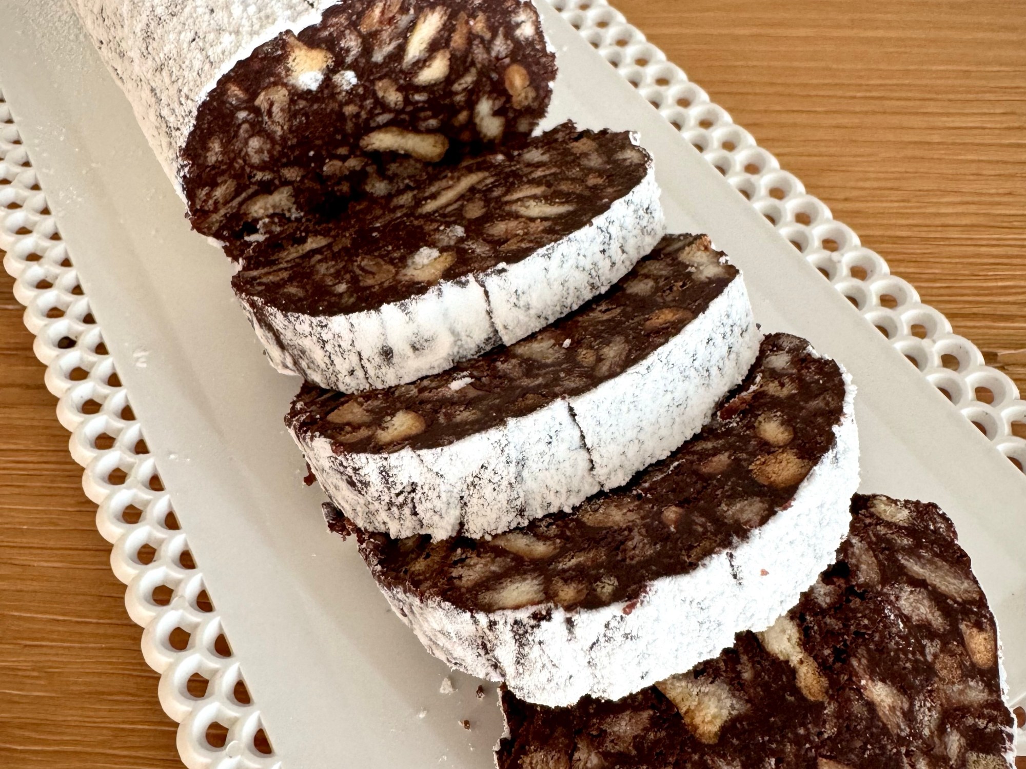 2. Nel frattempo tritate grossolanamente i biscotti usando un coltello. Non devono essere sbriciolati troppo fini, si devono vedere i pezzi all’interno del salame quando lo tagliate.