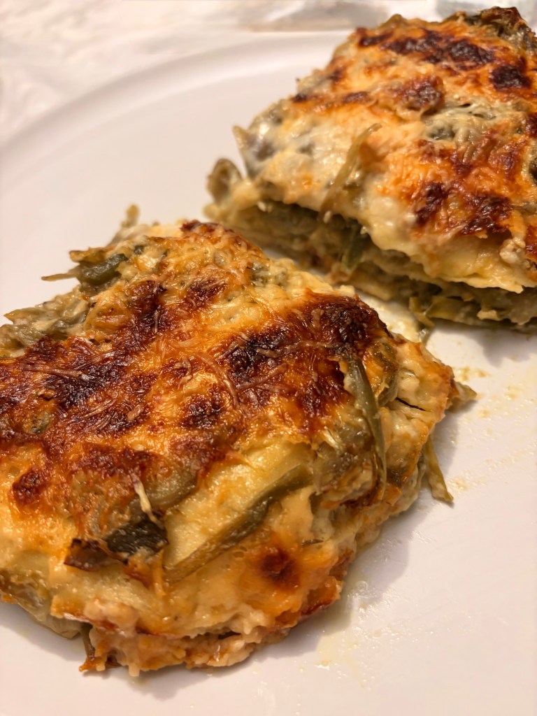 - Continuate con gli strati successivi: pasta-besciamella-carciofi-pecorino regolandovi nelle porzioni da usare per ogni strato in base a quanti potete ottenerne con le dimensioni della pirofila scelta (3 o 4).