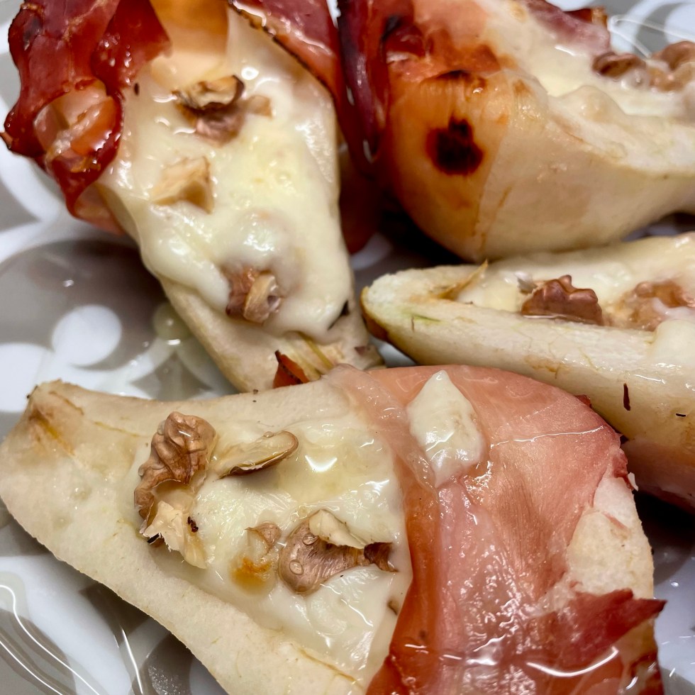 Pere in camicia di Speck ripiene di Taleggio e Noci
