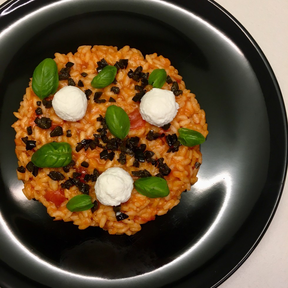 Risotto al Pomodoro con Ricotta Fresca, Olive nere & Basilico