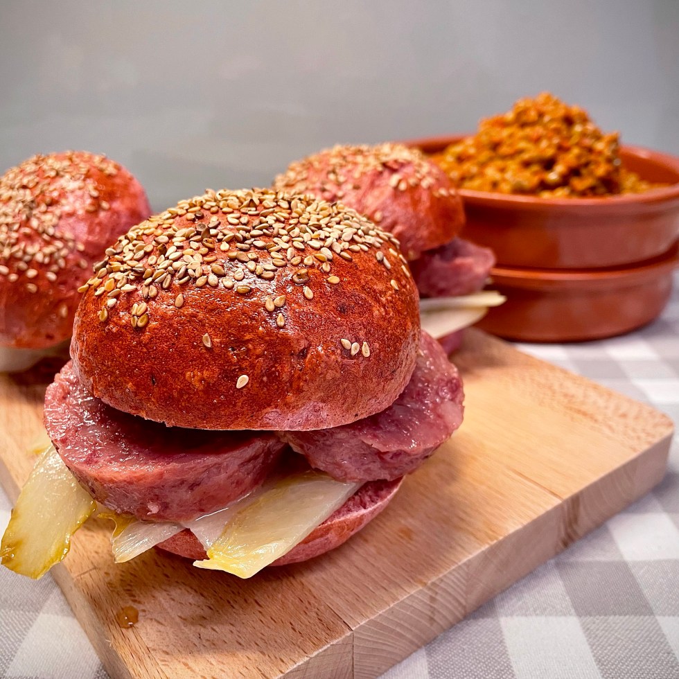Cotechino Burger con Senape, Indivia belga e pane alla Barbabietola