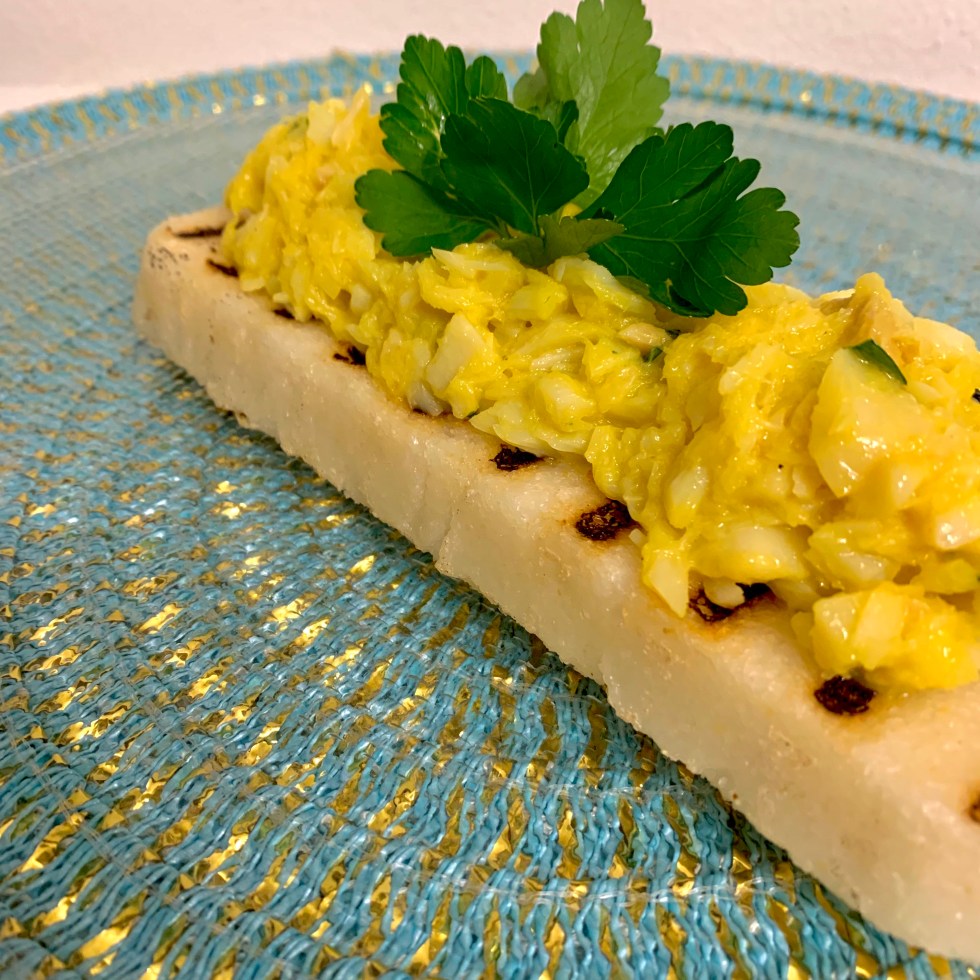 Crostone di Polenta Bianca con Baccalà allo Zafferano