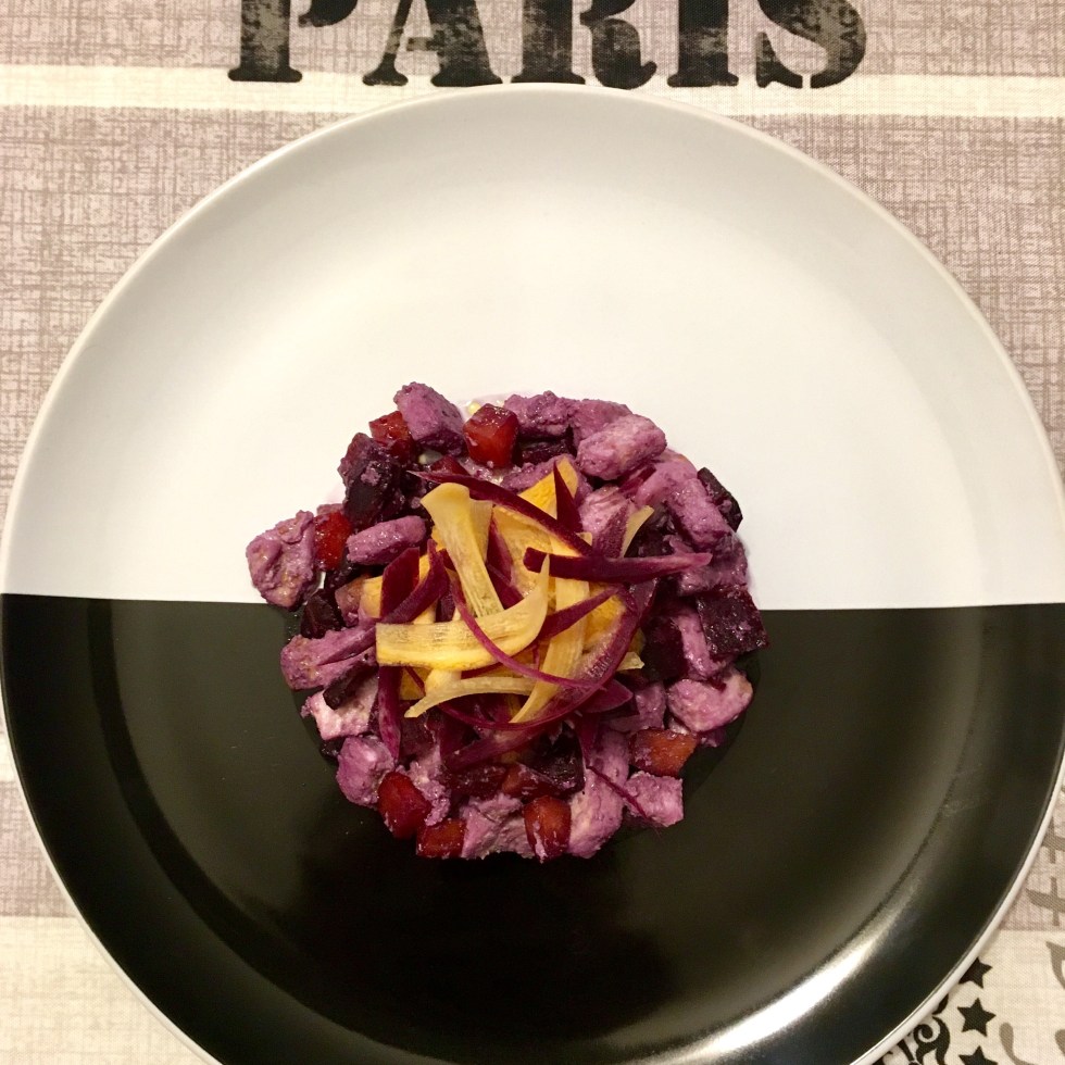 Dadolata di Spada marinato al Mandarino con Brunoise di Carote Viola
